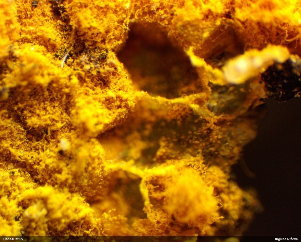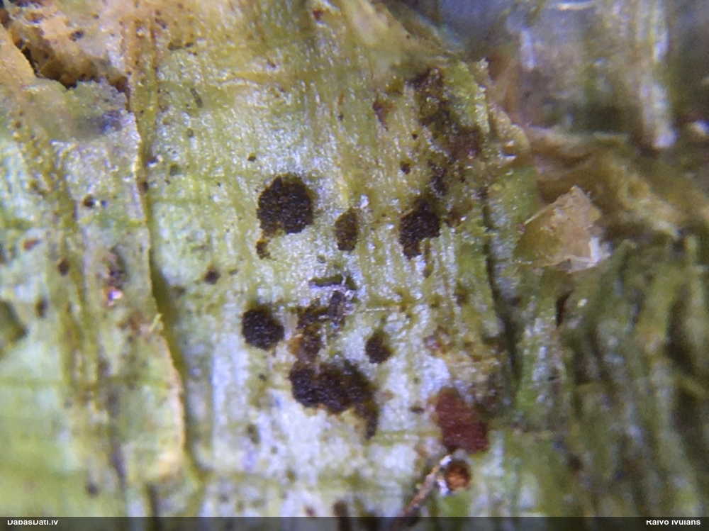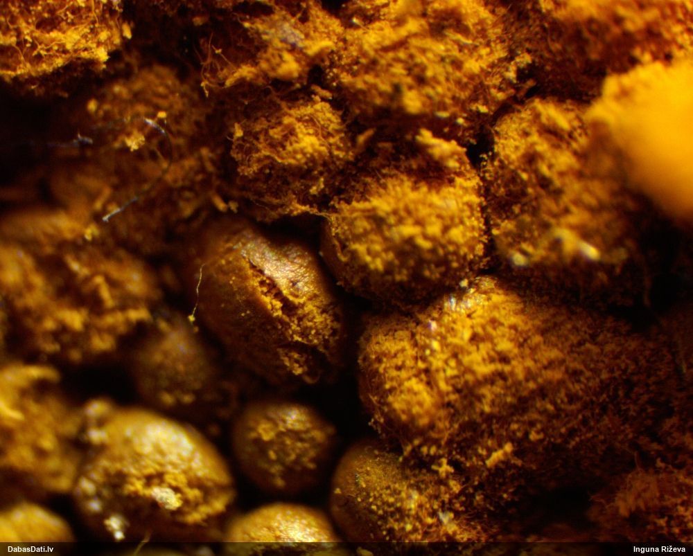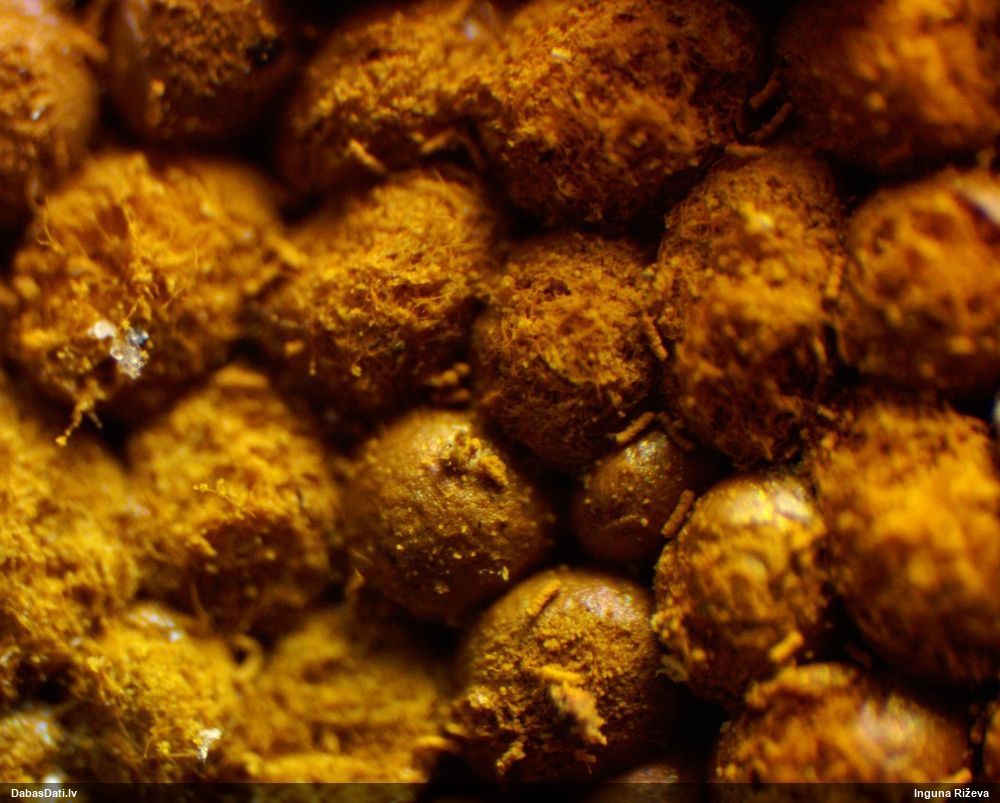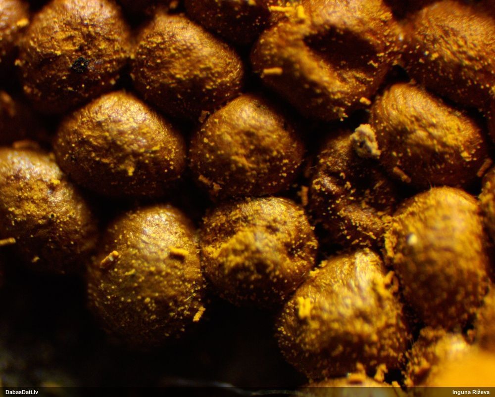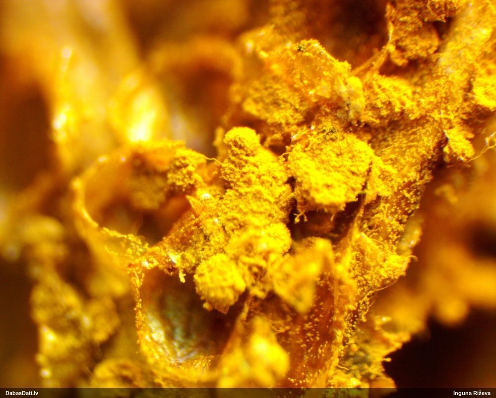 Ļoti ļoti labs atradums! Šo varētu likt aizsargājamo sugu sarakstā, jo pasaulē reti ziņota, Latvijā tikai izcilās vietās atrasta. Par laimi, paraugā bija arī nobrieduši eksemplāri, kam sporu mākonis knapi turējās klāt - un tā ir arī raksturīga sugas pazīme. Bet visuzskatāmākais te ir sporu virsmas raksts, tāpēc te svarīgi redzēt sporas vislielākajā palielinājumā.