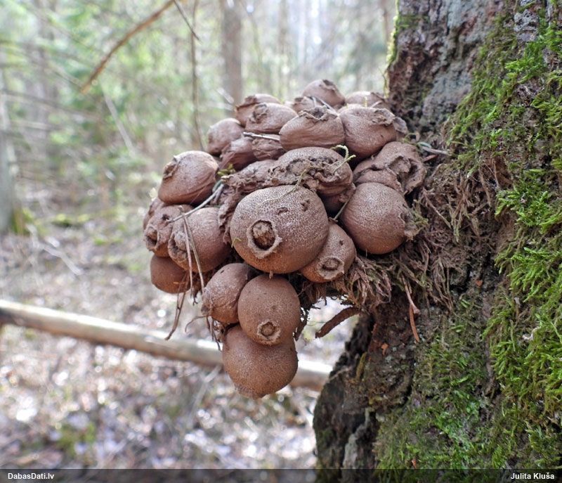 Hmm, nepievērsu tam uzmanību, bet tas interesanti, paldies! Vispār izskatās pēc vālenītes, ne kūlītes, speciāli salīdzināju aprakstus ar Stemonitis splendens, bet mikroskopiski tomēr atbilst visām kūlītes pazīmēm, un abas mikroskopētās kūlītes - vienādas. Tur kāds skujkoks blakus neaug?