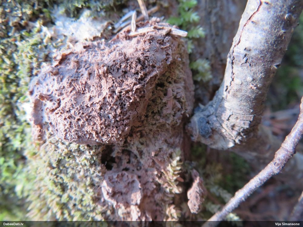 Skujkoks nav par tuvumā. Ir tikai lapu koki - lazda, kastanis, ābelītes. Otrpus celmam (D pusē) lejasdaļā, ko pamanīju pirmo, arī bija kaut kas no šim līdzīga, bet tik izsporojies, ka palicis tikai paliels brūns sporu pleķis. Intriga pavērot nākamgad.