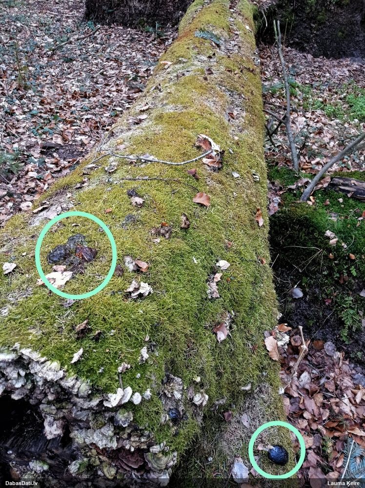 Skujkoks nav par tuvumā. Ir tikai lapu koki - lazda, kastanis, ābelītes. Otrpus celmam (D pusē) lejasdaļā, ko pamanīju pirmo, arī bija kaut kas no šim līdzīga, bet tik izsporojies, ka palicis tikai paliels brūns sporu pleķis. Intriga pavērot nākamgad.
