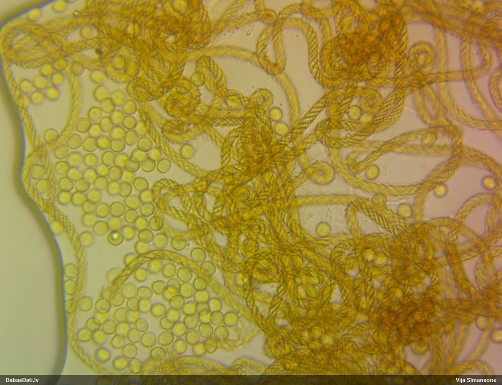 Ļoti ļoti labs atradums! Šo varētu likt aizsargājamo sugu sarakstā, jo pasaulē reti ziņota, Latvijā tikai izcilās vietās atrasta. Par laimi, paraugā bija arī nobrieduši eksemplāri, kam sporu mākonis knapi turējās klāt - un tā ir arī raksturīga sugas pazīme. Bet visuzskatāmākais te ir sporu virsmas raksts, tāpēc te svarīgi redzēt sporas vislielākajā palielinājumā.
