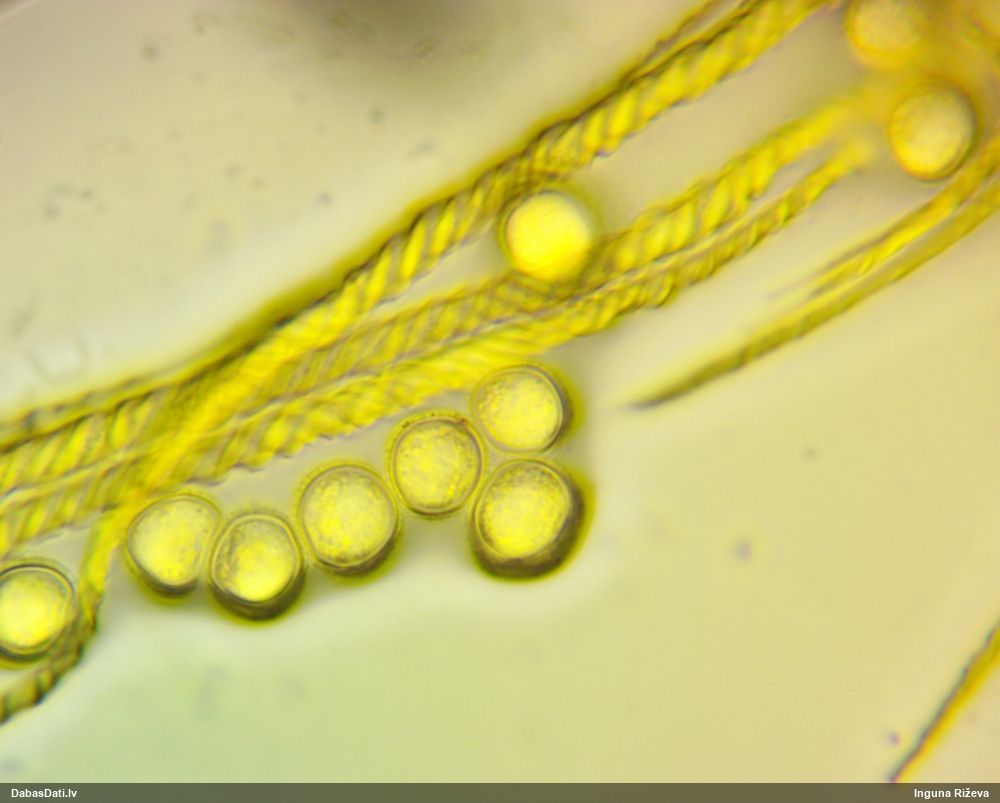 Ļoti ļoti labs atradums! Šo varētu likt aizsargājamo sugu sarakstā, jo pasaulē reti ziņota, Latvijā tikai izcilās vietās atrasta. Par laimi, paraugā bija arī nobrieduši eksemplāri, kam sporu mākonis knapi turējās klāt - un tā ir arī raksturīga sugas pazīme. Bet visuzskatāmākais te ir sporu virsmas raksts, tāpēc te svarīgi redzēt sporas vislielākajā palielinājumā.