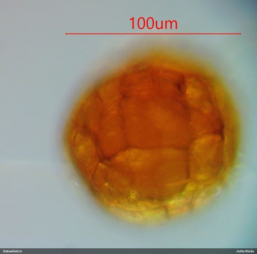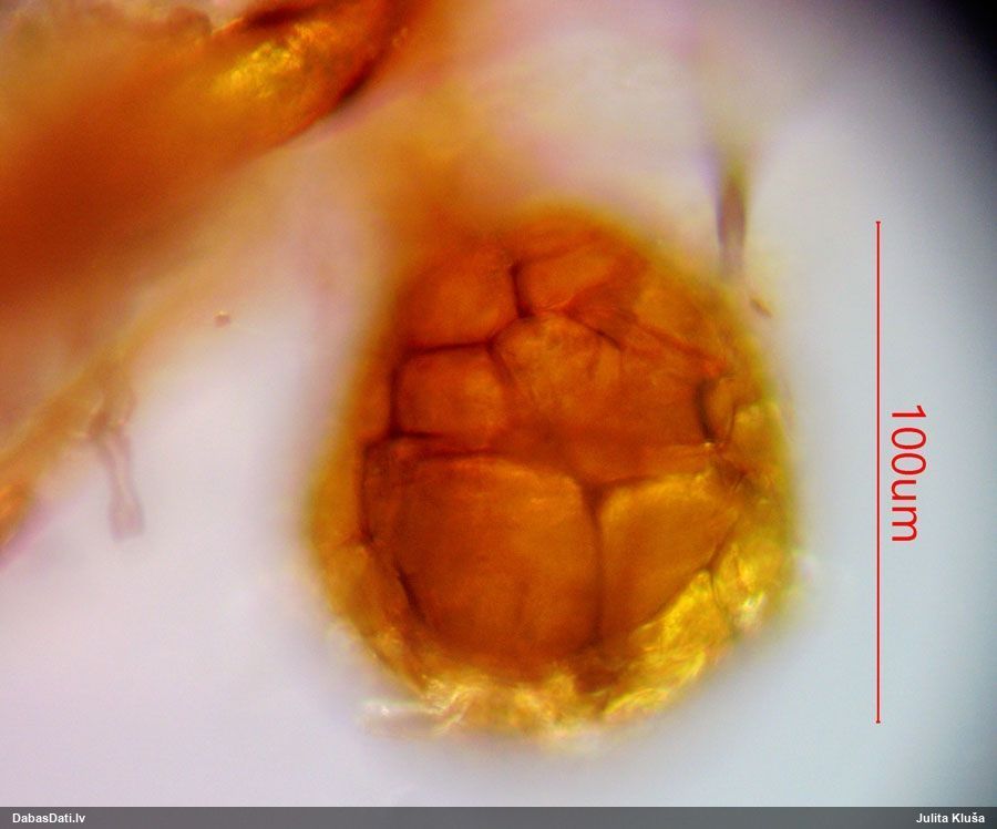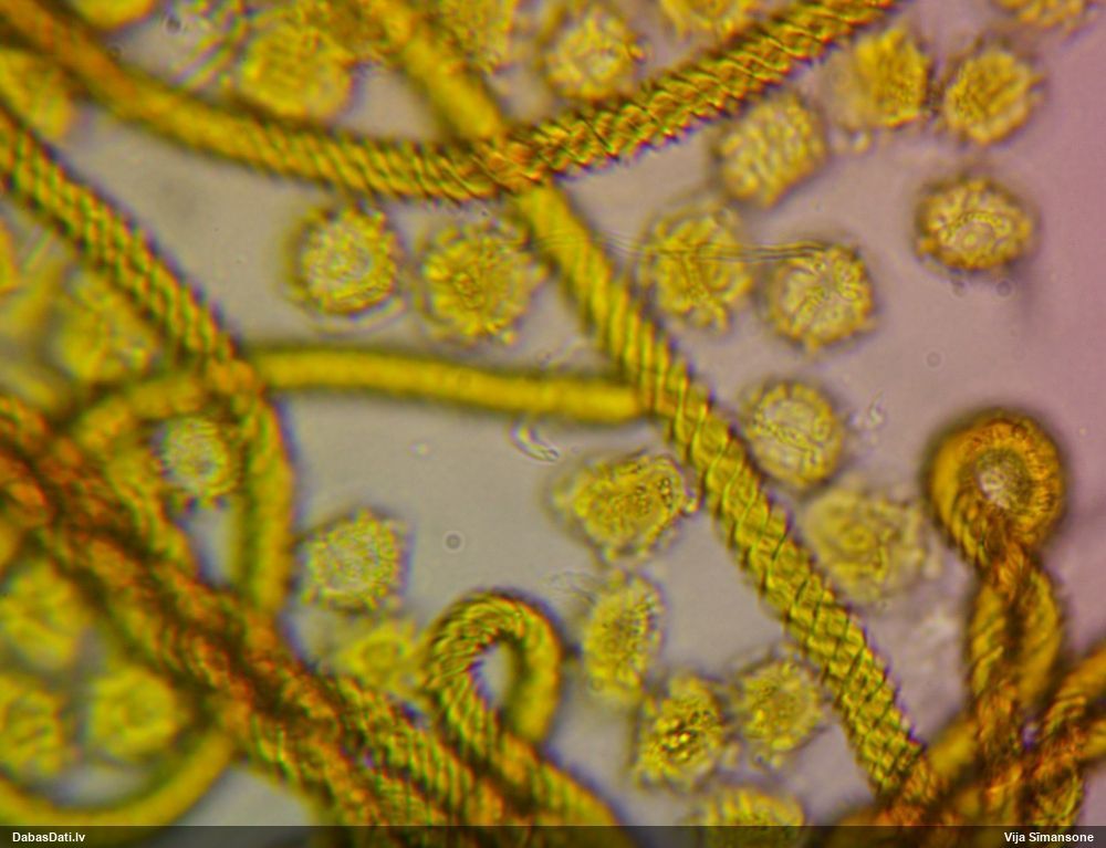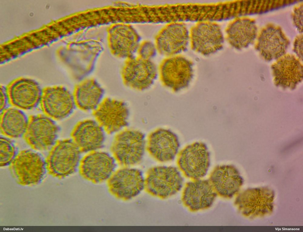 Ļoti ļoti labs atradums! Šo varētu likt aizsargājamo sugu sarakstā, jo pasaulē reti ziņota, Latvijā tikai izcilās vietās atrasta. Par laimi, paraugā bija arī nobrieduši eksemplāri, kam sporu mākonis knapi turējās klāt - un tā ir arī raksturīga sugas pazīme. Bet visuzskatāmākais te ir sporu virsmas raksts, tāpēc te svarīgi redzēt sporas vislielākajā palielinājumā.