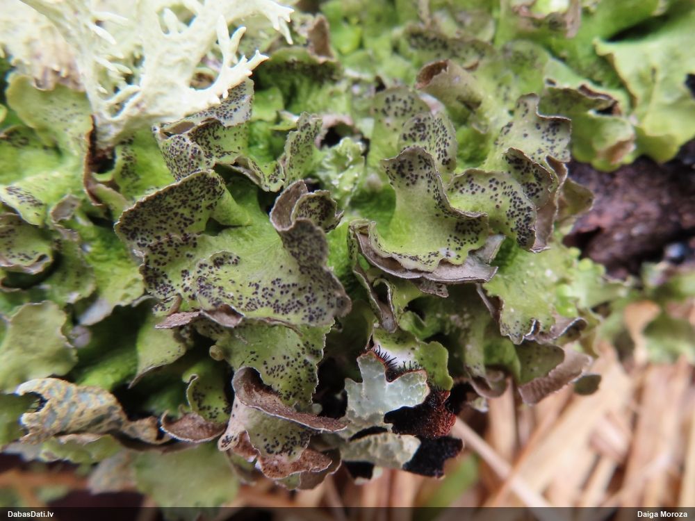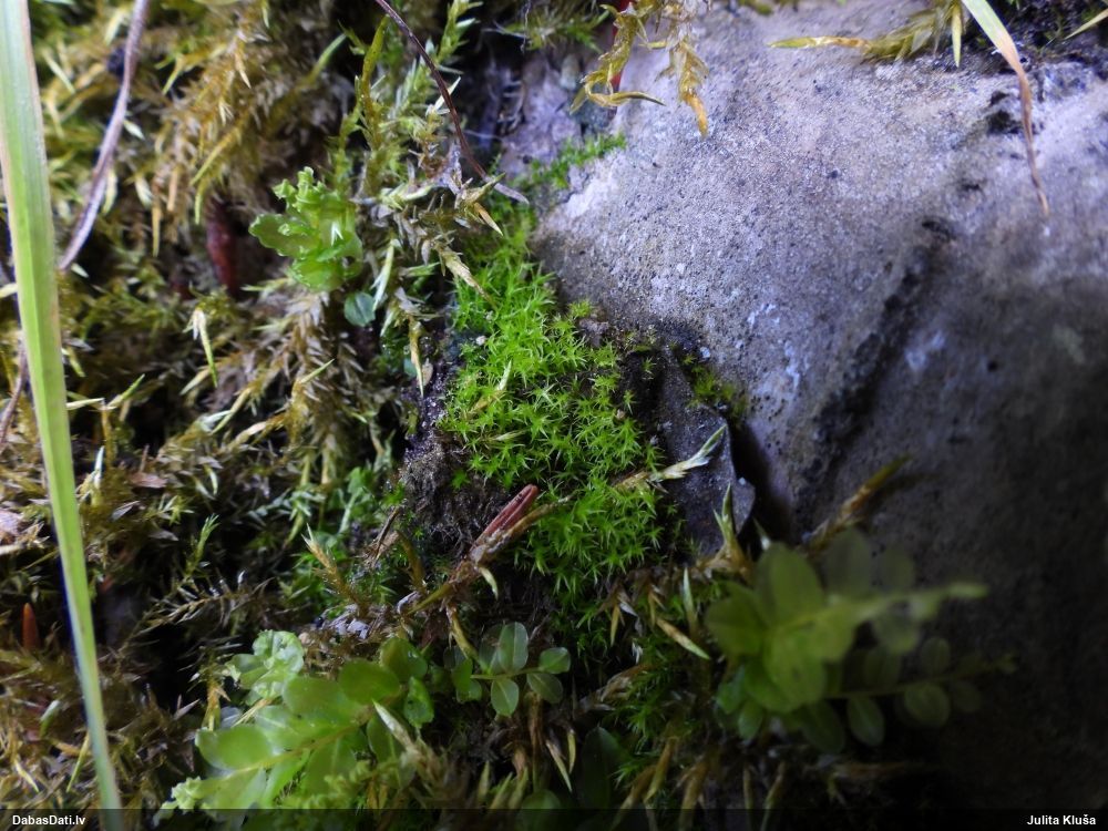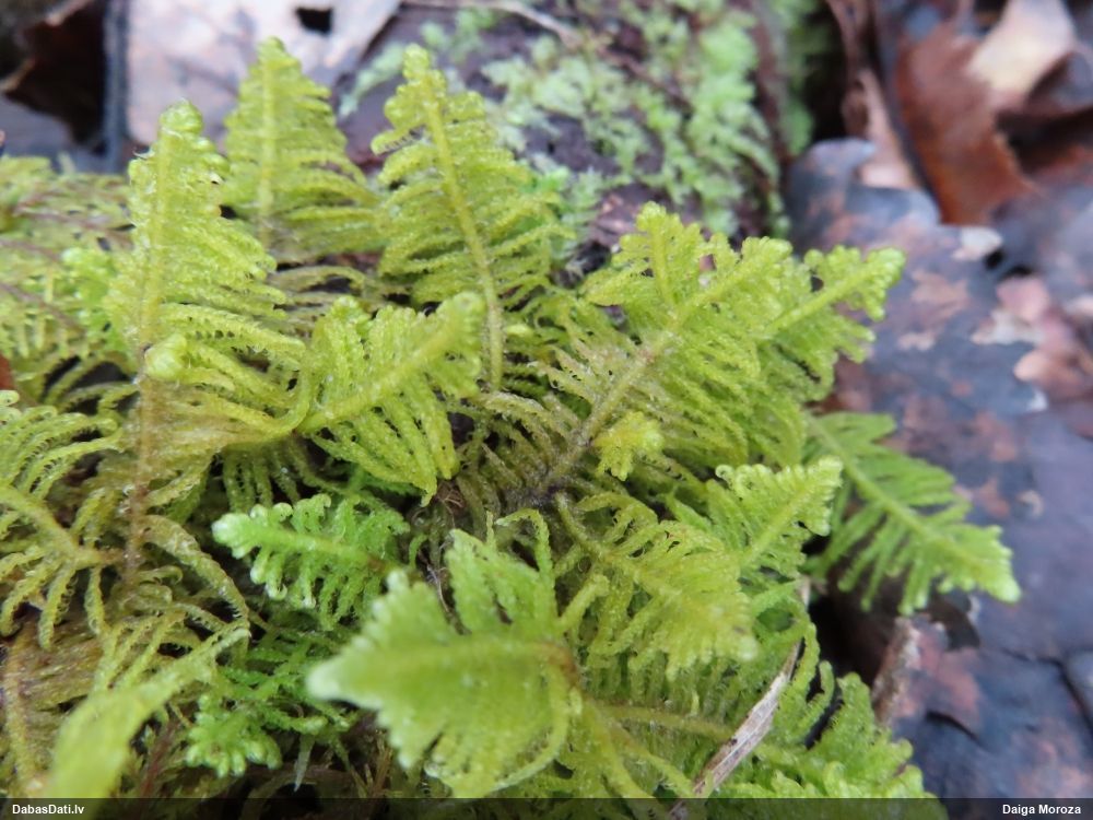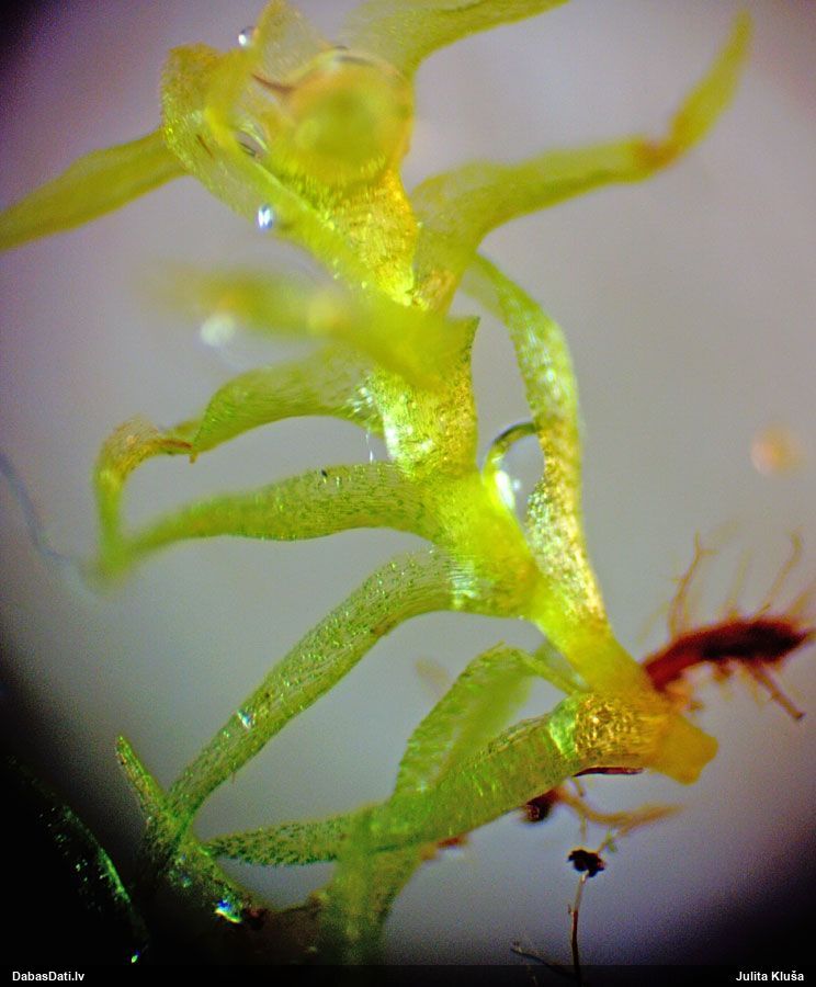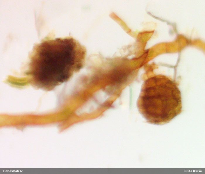 Ļoti ļoti labs atradums! Šo varētu likt aizsargājamo sugu sarakstā, jo pasaulē reti ziņota, Latvijā tikai izcilās vietās atrasta. Par laimi, paraugā bija arī nobrieduši eksemplāri, kam sporu mākonis knapi turējās klāt - un tā ir arī raksturīga sugas pazīme. Bet visuzskatāmākais te ir sporu virsmas raksts, tāpēc te svarīgi redzēt sporas vislielākajā palielinājumā.