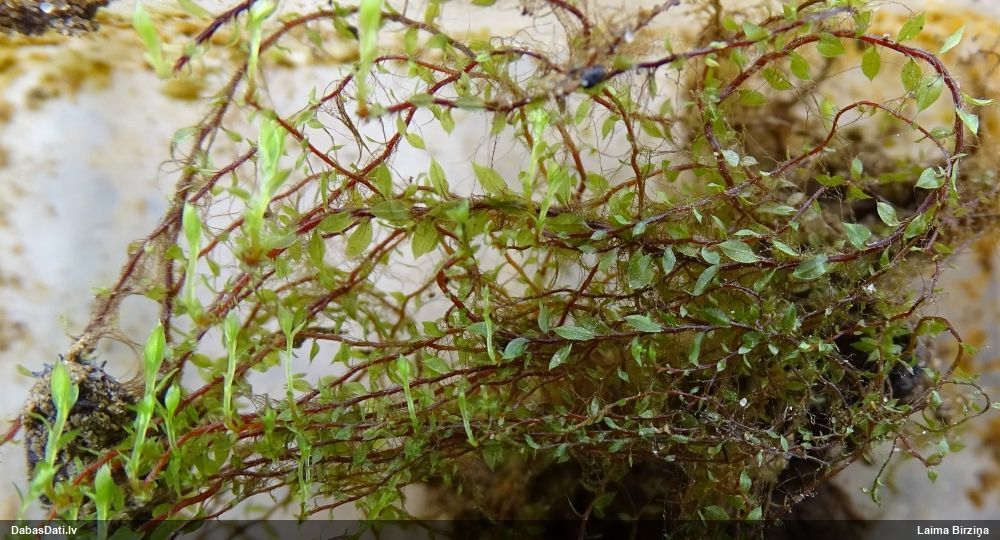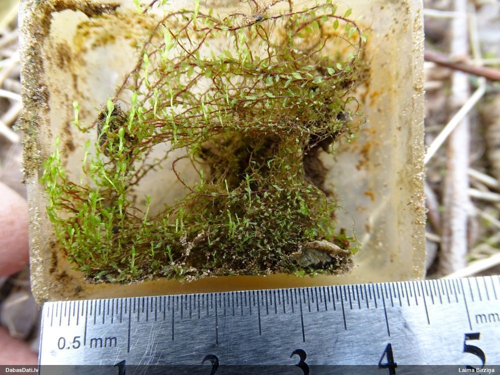 Ļoti ļoti labs atradums! Šo varētu likt aizsargājamo sugu sarakstā, jo pasaulē reti ziņota, Latvijā tikai izcilās vietās atrasta. Par laimi, paraugā bija arī nobrieduši eksemplāri, kam sporu mākonis knapi turējās klāt - un tā ir arī raksturīga sugas pazīme. Bet visuzskatāmākais te ir sporu virsmas raksts, tāpēc te svarīgi redzēt sporas vislielākajā palielinājumā.