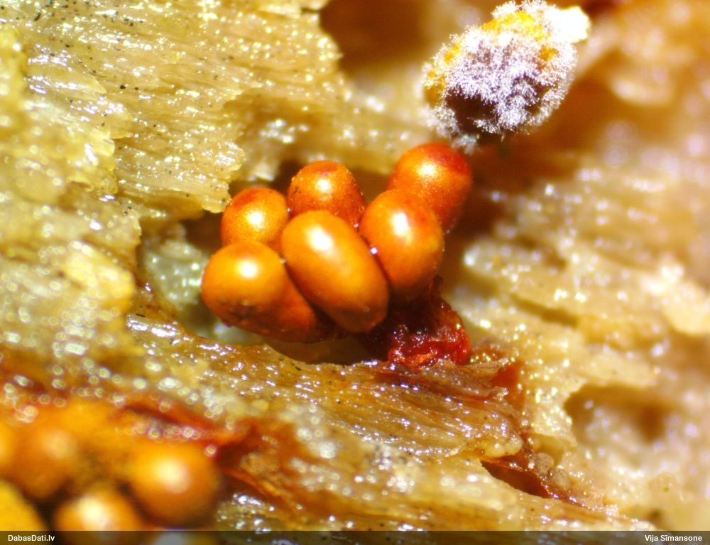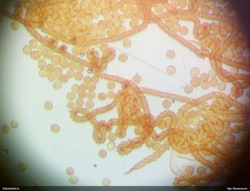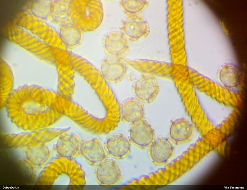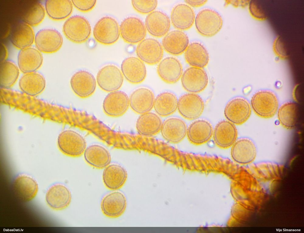 Ar sporām negāja viegli. Ir sīks neregulārs punktējums (kārpiņas?), brīžiem var "uzķert" tādas kā tīklveida struktūras, korektāks sporu diametrs 6,5-7,0 mkm.