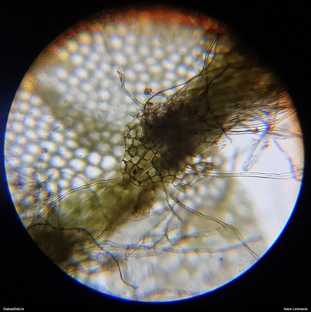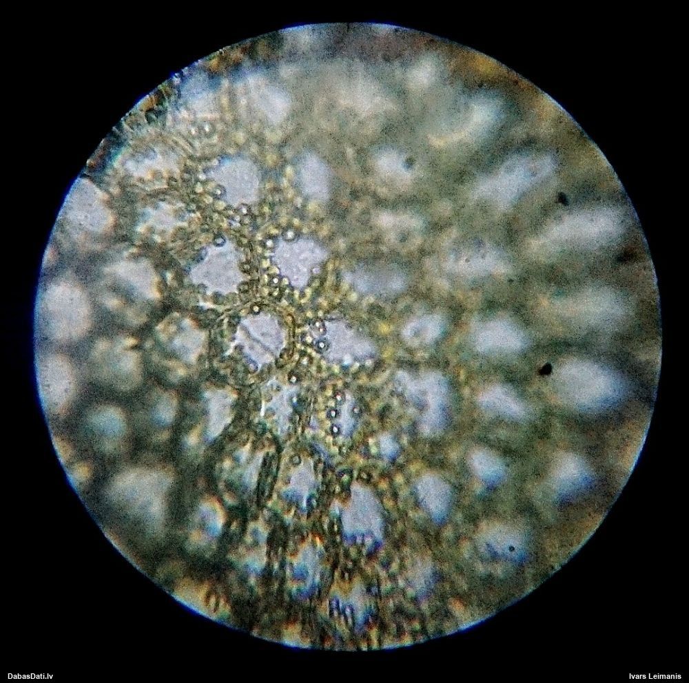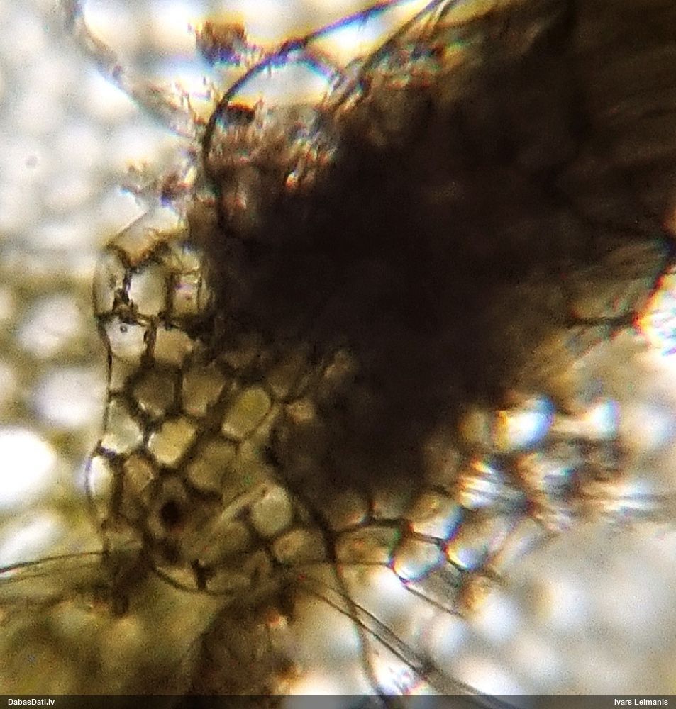 Ar sporām negāja viegli. Ir sīks neregulārs punktējums (kārpiņas?), brīžiem var "uzķert" tādas kā tīklveida struktūras, korektāks sporu diametrs 6,5-7,0 mkm.