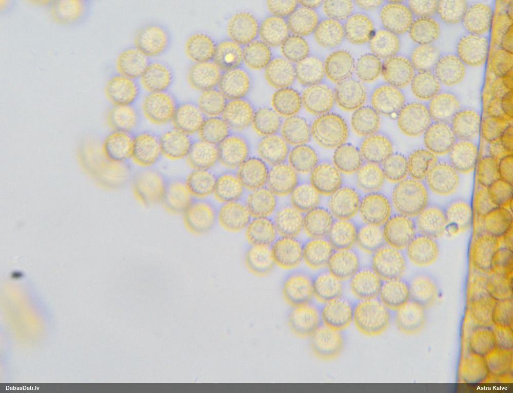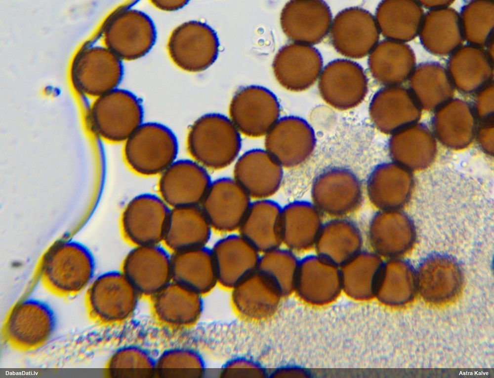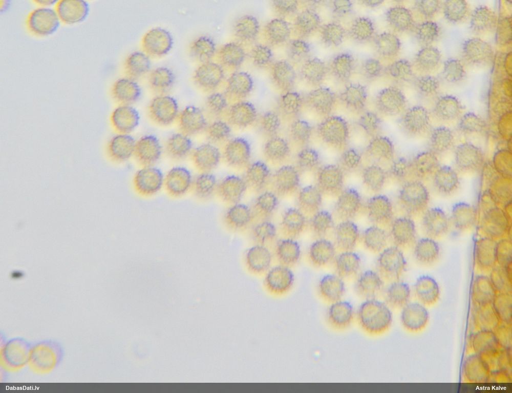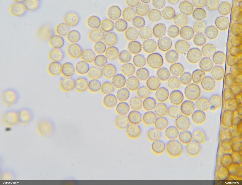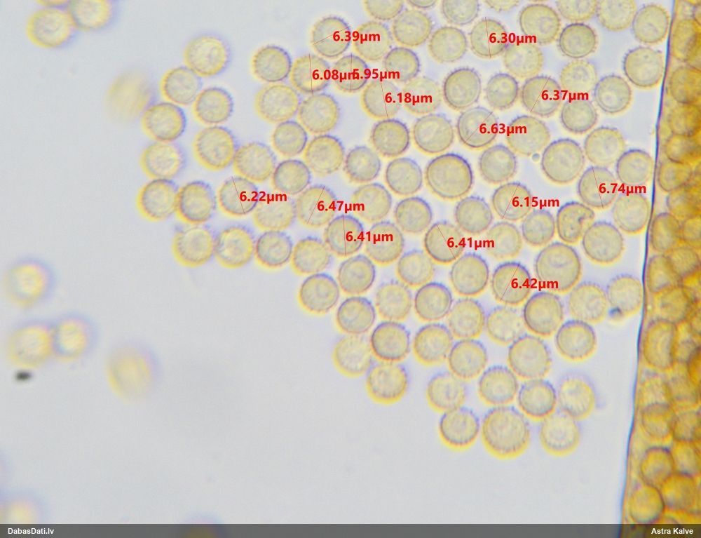 Ar sporām negāja viegli. Ir sīks neregulārs punktējums (kārpiņas?), brīžiem var "uzķert" tādas kā tīklveida struktūras, korektāks sporu diametrs 6,5-7,0 mkm.