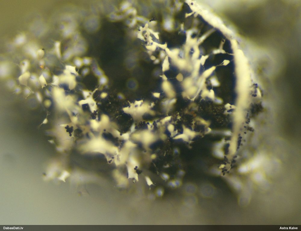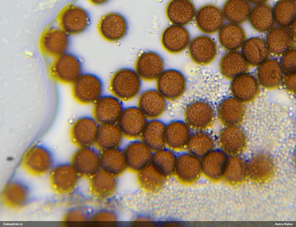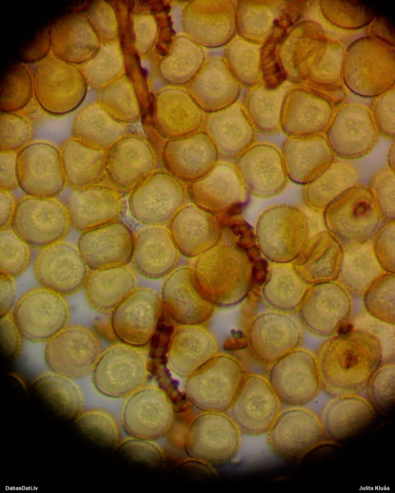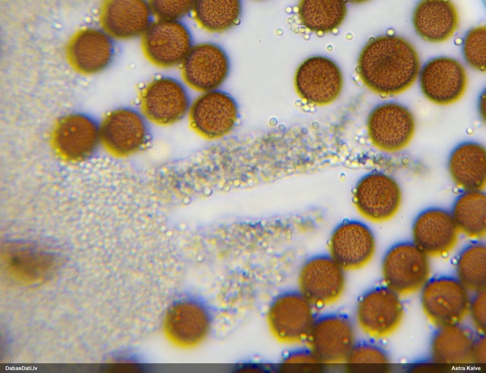 Ar sporām negāja viegli. Ir sīks neregulārs punktējums (kārpiņas?), brīžiem var "uzķert" tādas kā tīklveida struktūras, korektāks sporu diametrs 6,5-7,0 mkm.