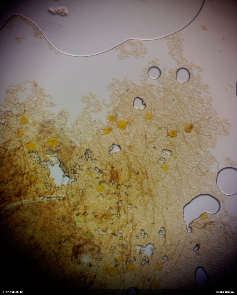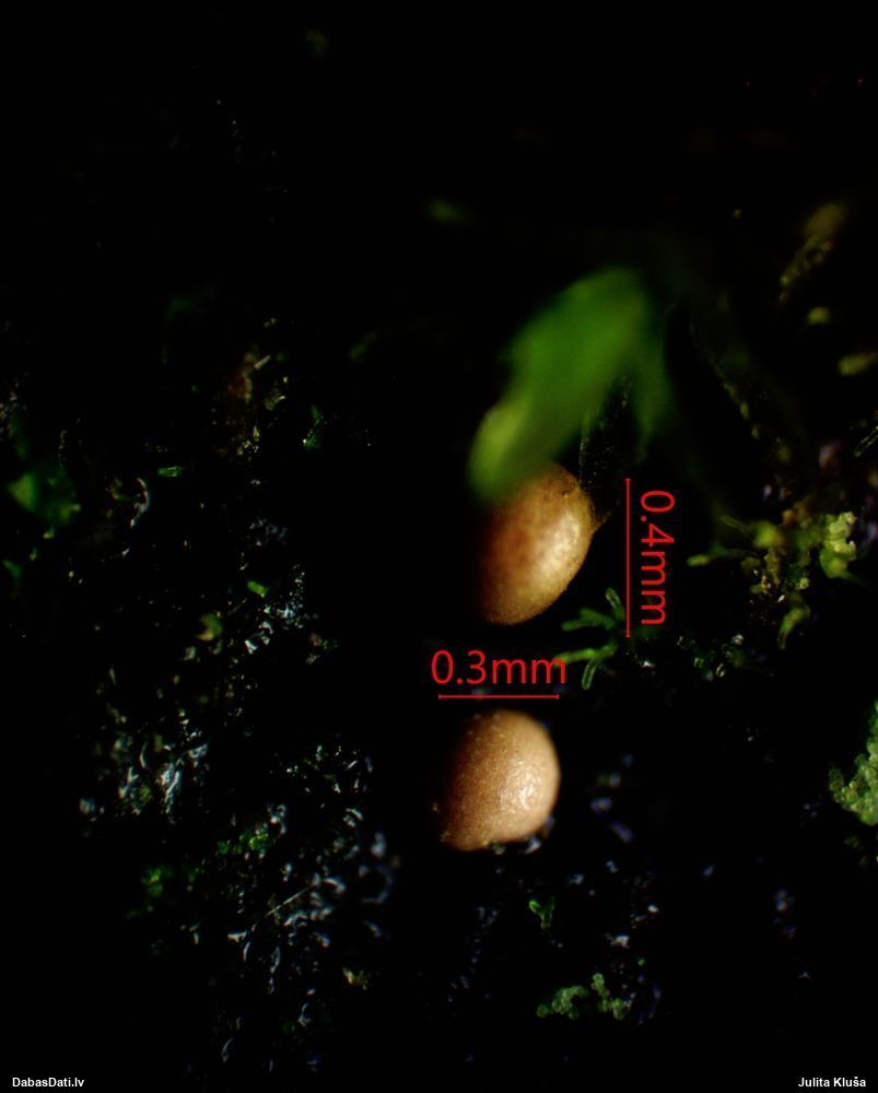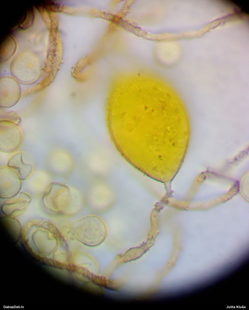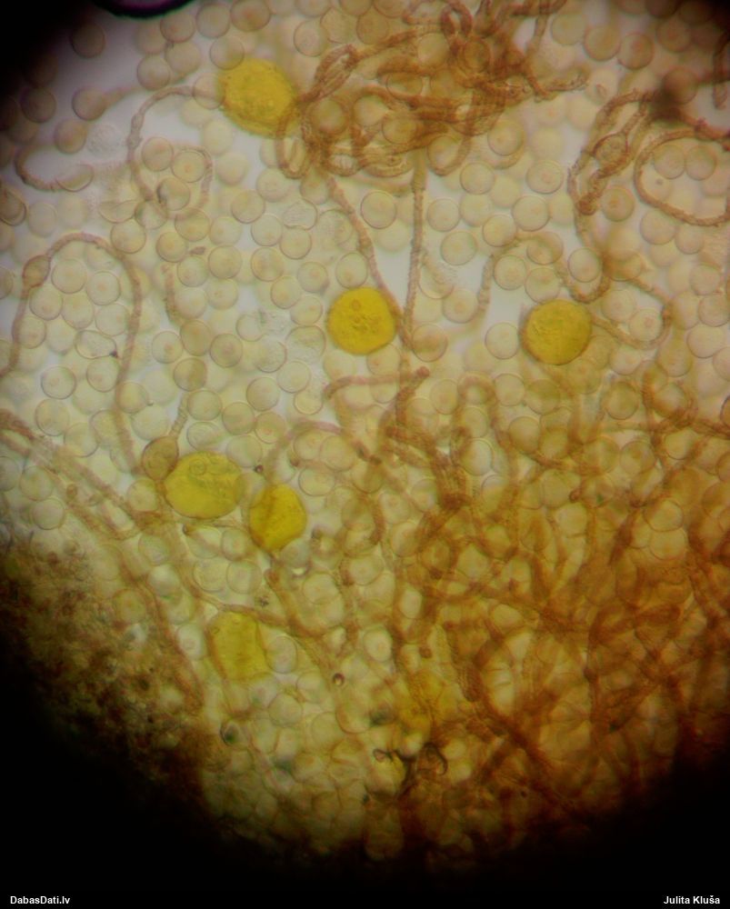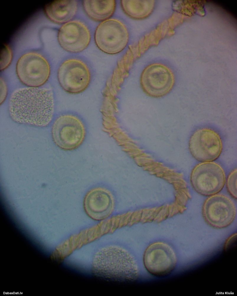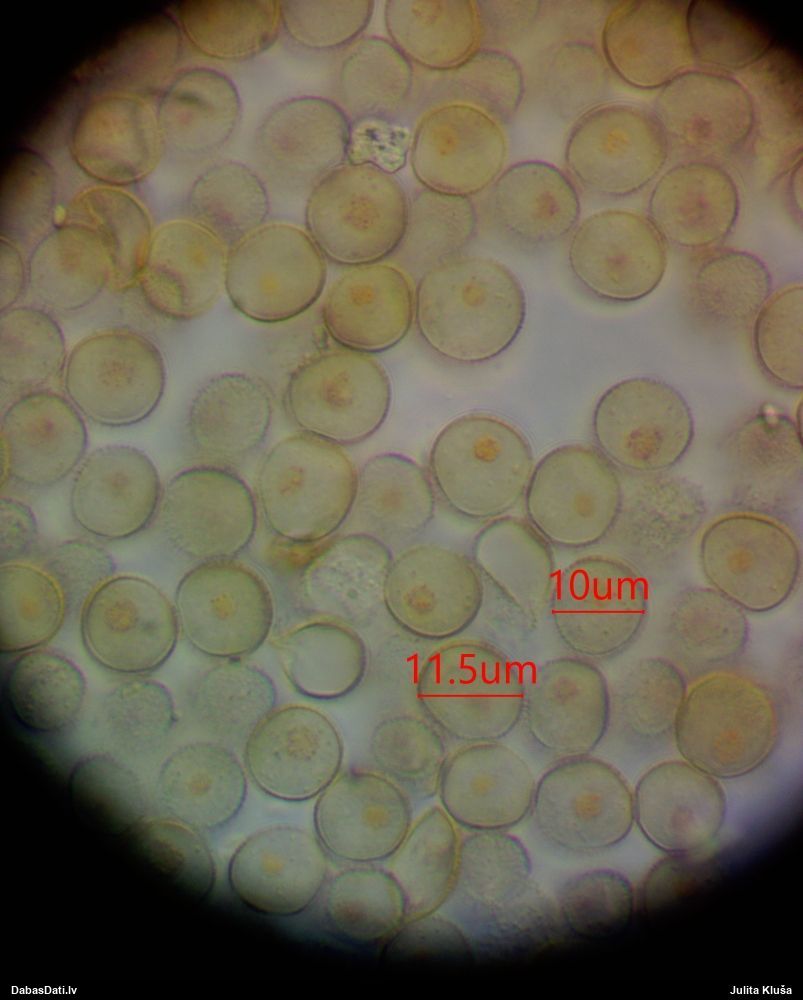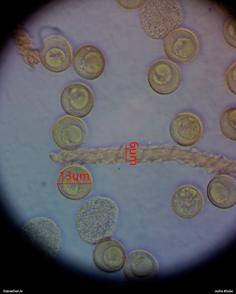 Ar sporām negāja viegli. Ir sīks neregulārs punktējums (kārpiņas?), brīžiem var "uzķert" tādas kā tīklveida struktūras, korektāks sporu diametrs 6,5-7,0 mkm.