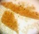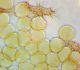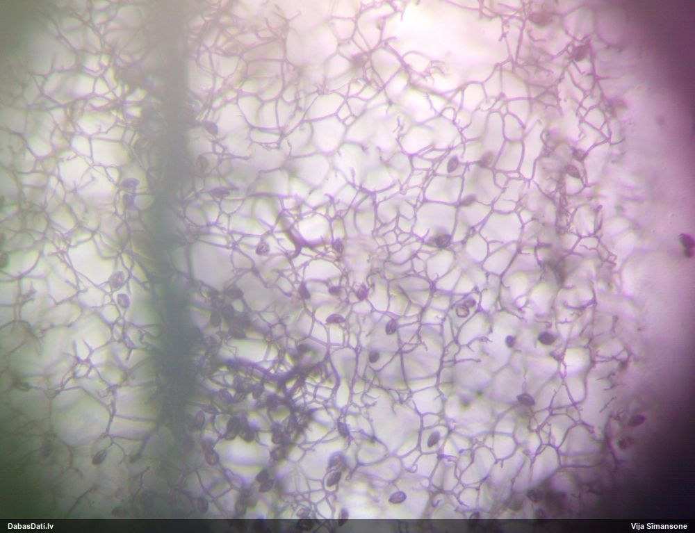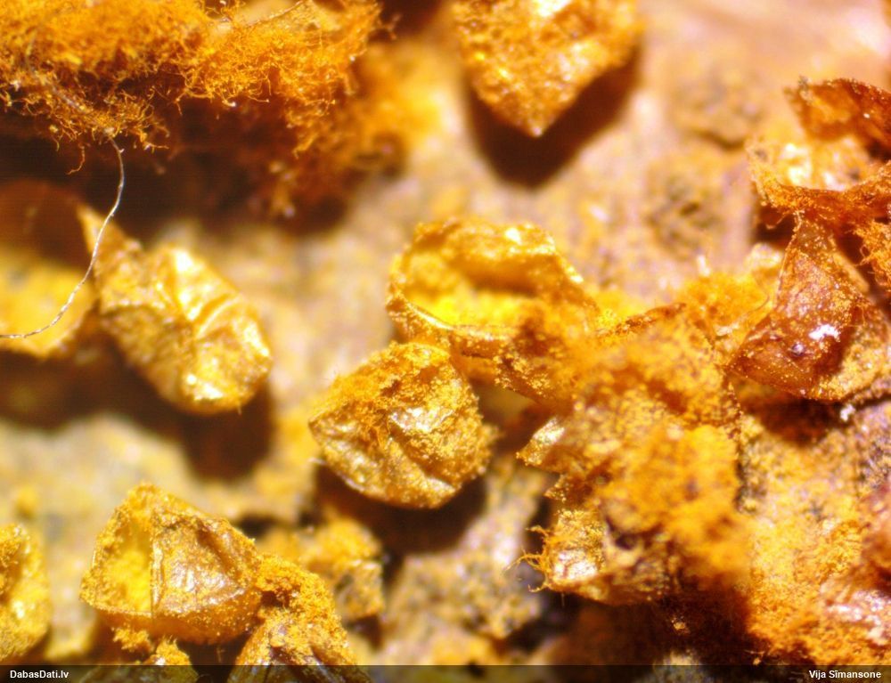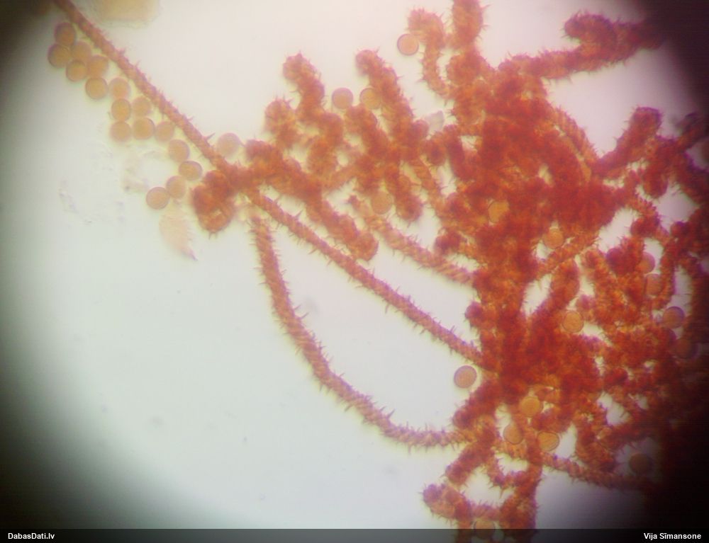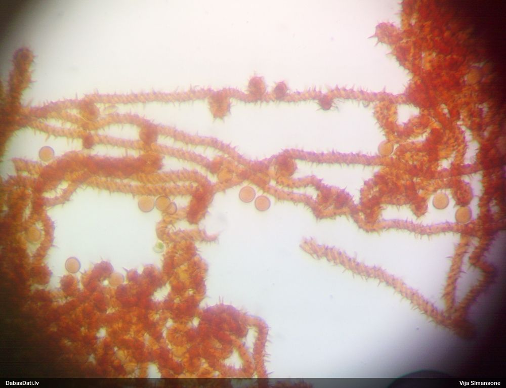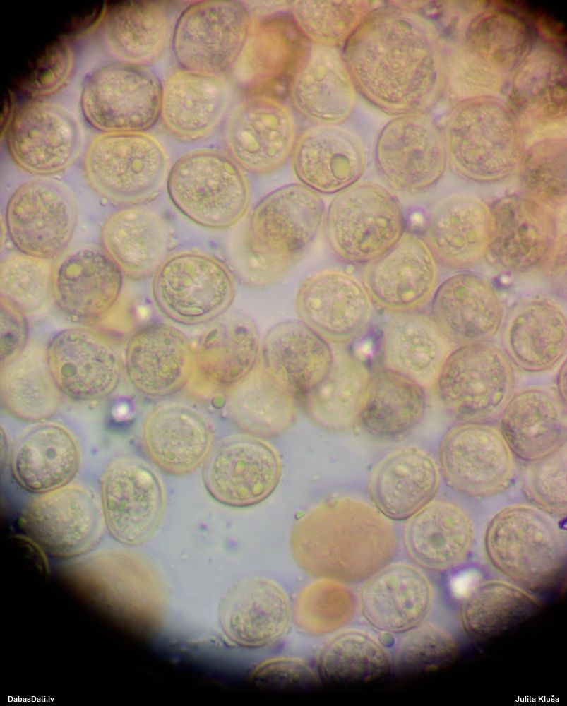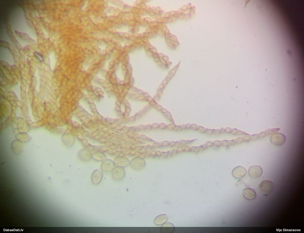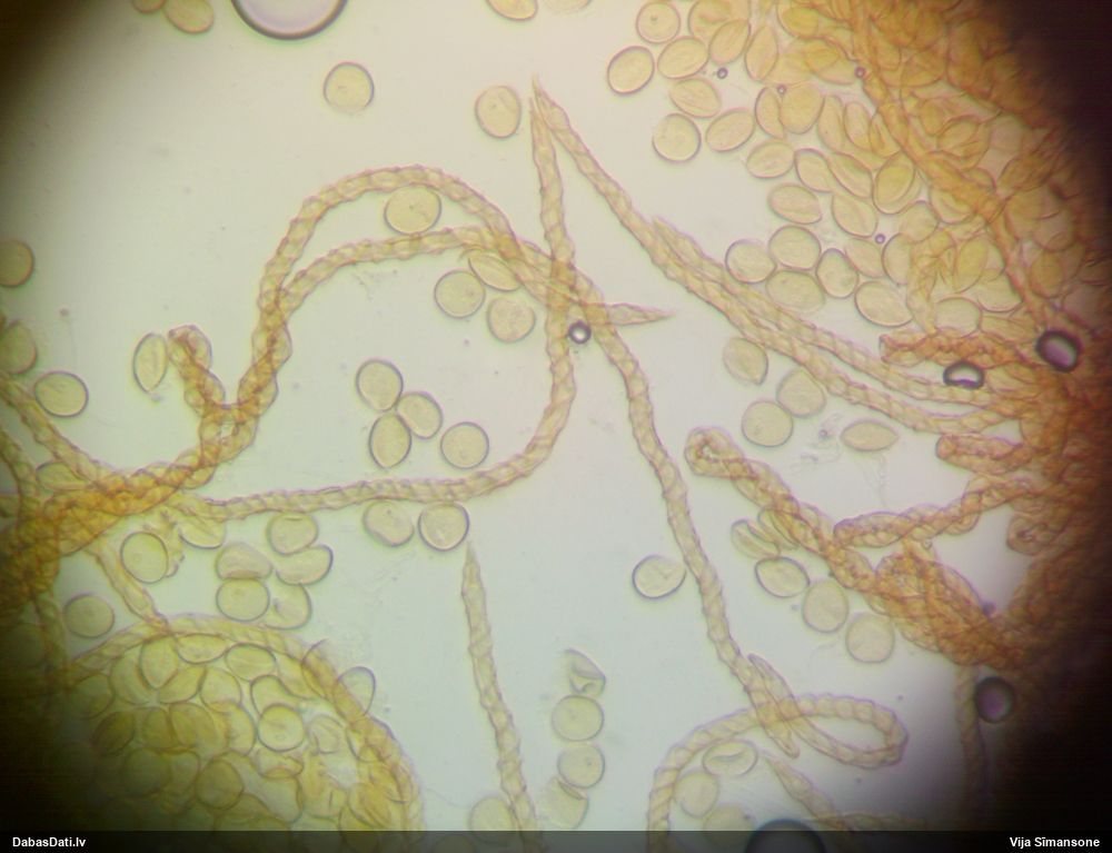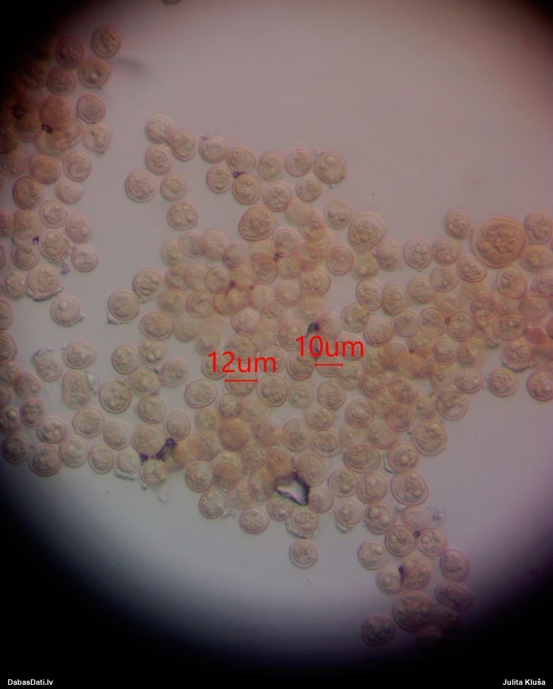 Ar sporām negāja viegli. Ir sīks neregulārs punktējums (kārpiņas?), brīžiem var "uzķert" tādas kā tīklveida struktūras, korektāks sporu diametrs 6,5-7,0 mkm.
