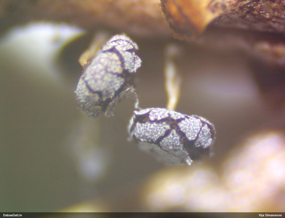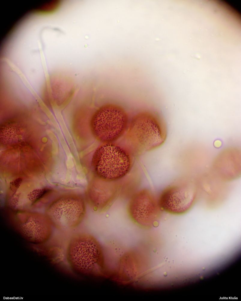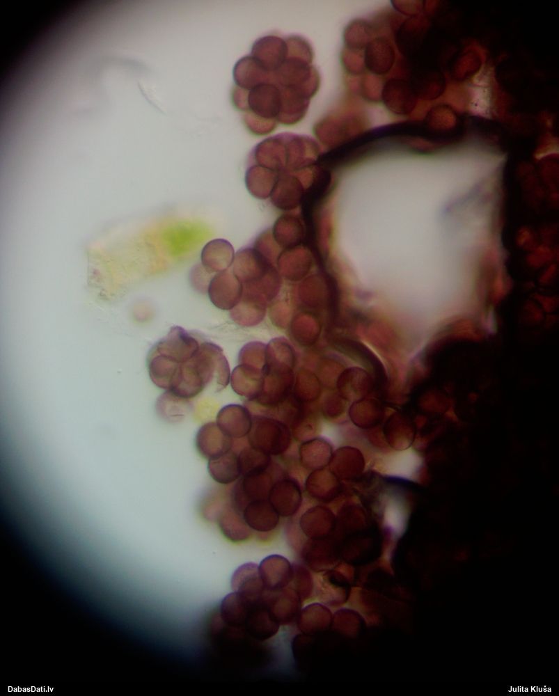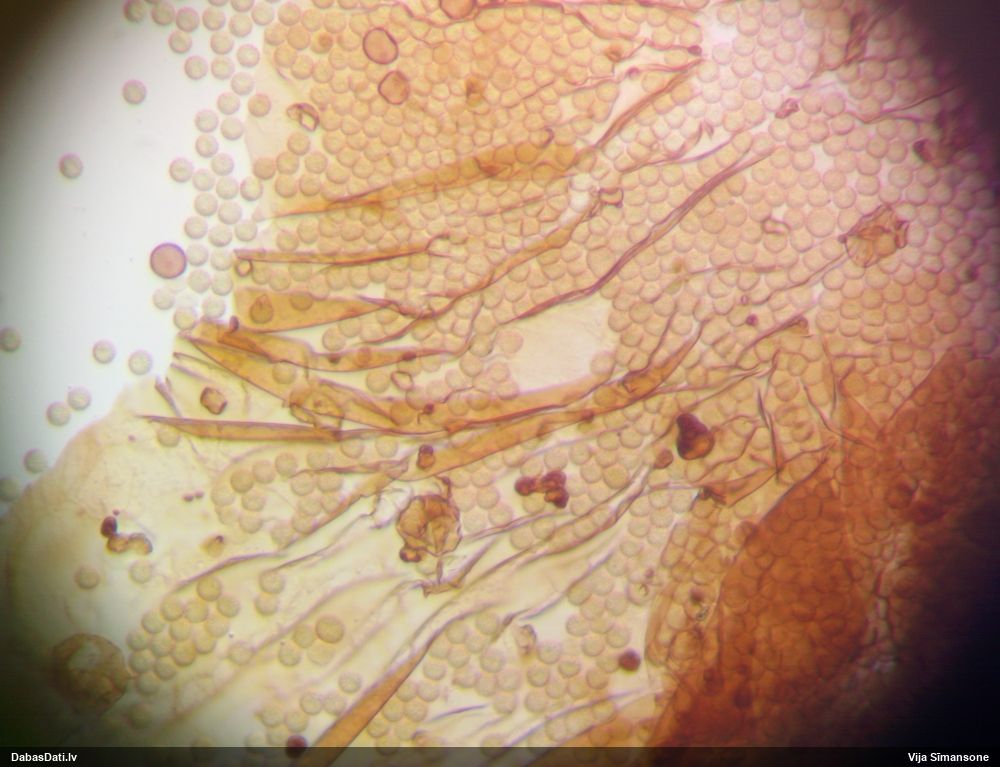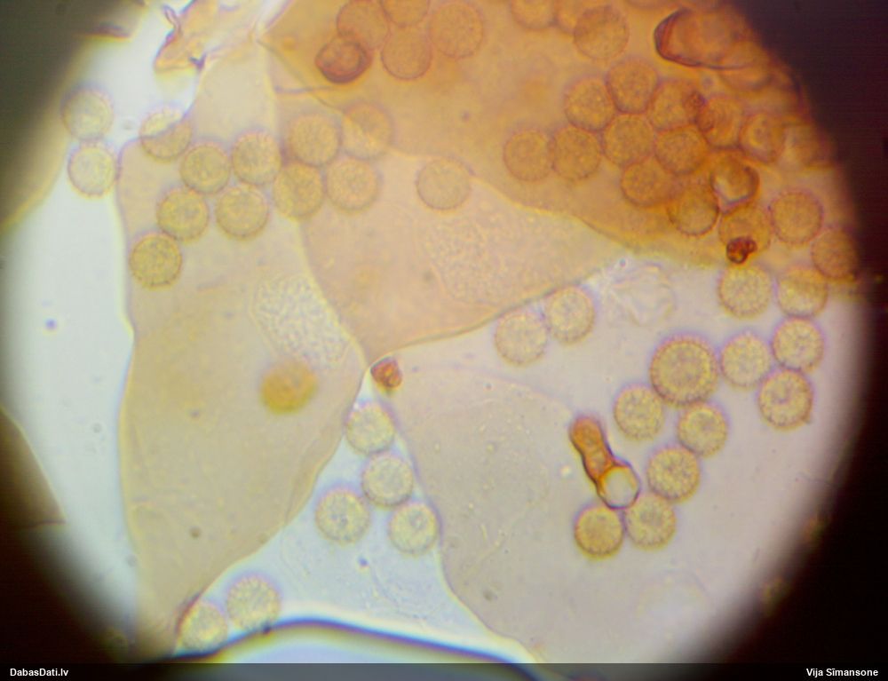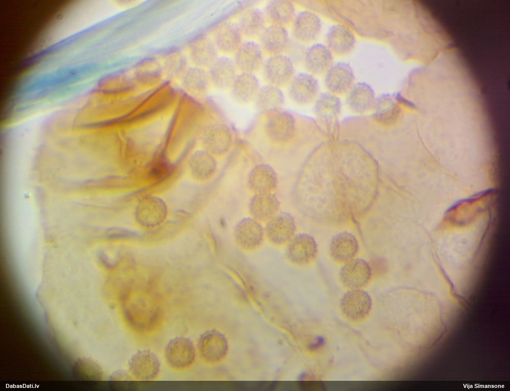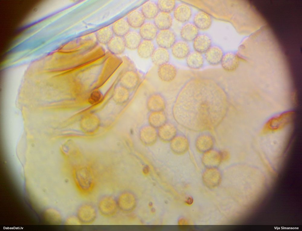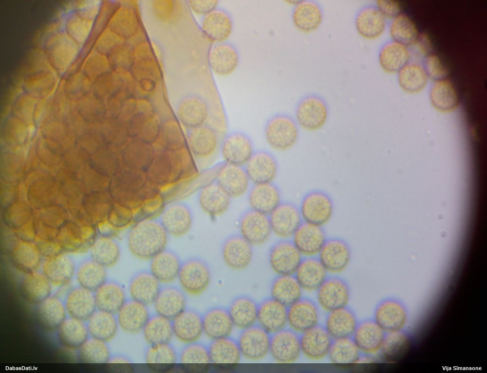 Ar sporām negāja viegli. Ir sīks neregulārs punktējums (kārpiņas?), brīžiem var "uzķert" tādas kā tīklveida struktūras, korektāks sporu diametrs 6,5-7,0 mkm.