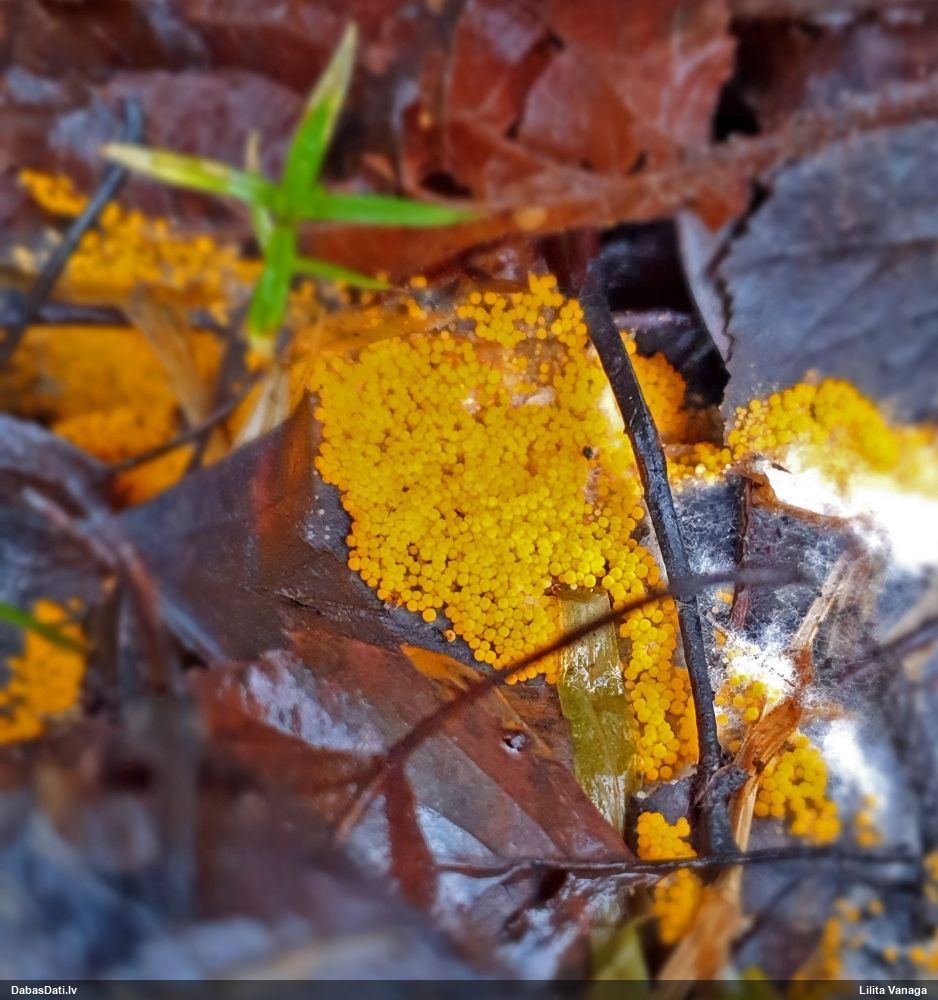 Jā, es par Tavu jau biju pieņēmusi lēmumu par Physarum oblatum, kam ir daudzveidīgas izpausmes, bet pirms gala vārda vēl paņēmu Maritas, kas šķita līdzīgs, bet ar baltu kāju, kas gan neiederētos pie oblatum. Nu un tā jūsu kopdarbs kopā ar Nannengu aizveda līdz rezultātam :)). Šitie dzeltenie ir Dievišķi no skata, bet velnišķīgi priekš noteikšanas.