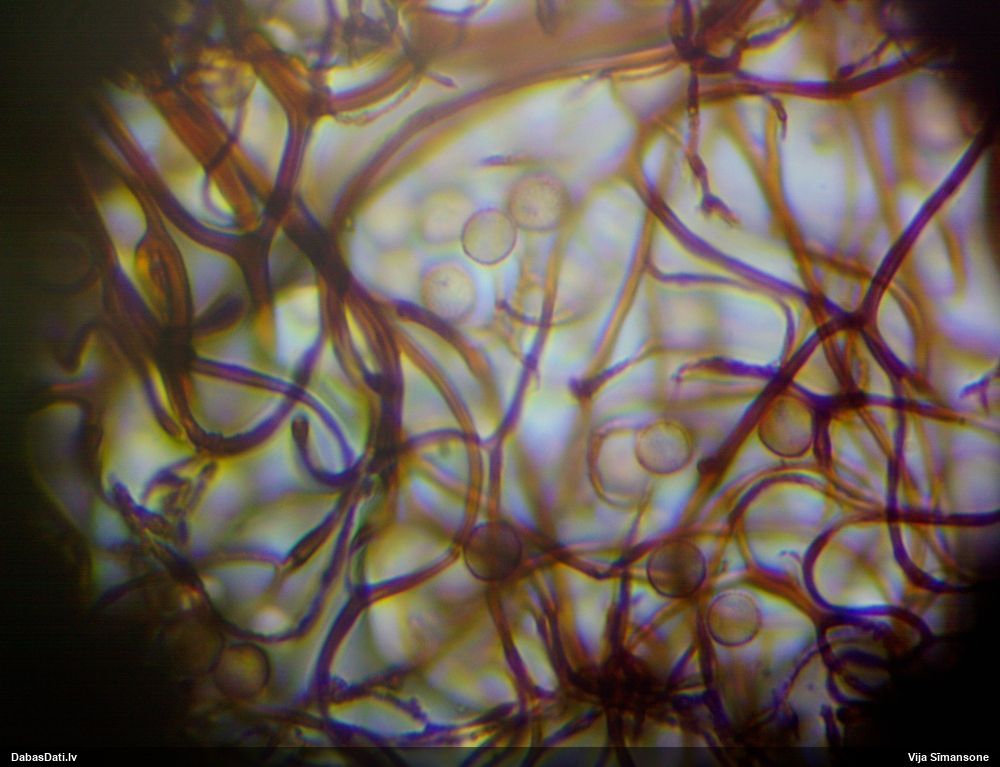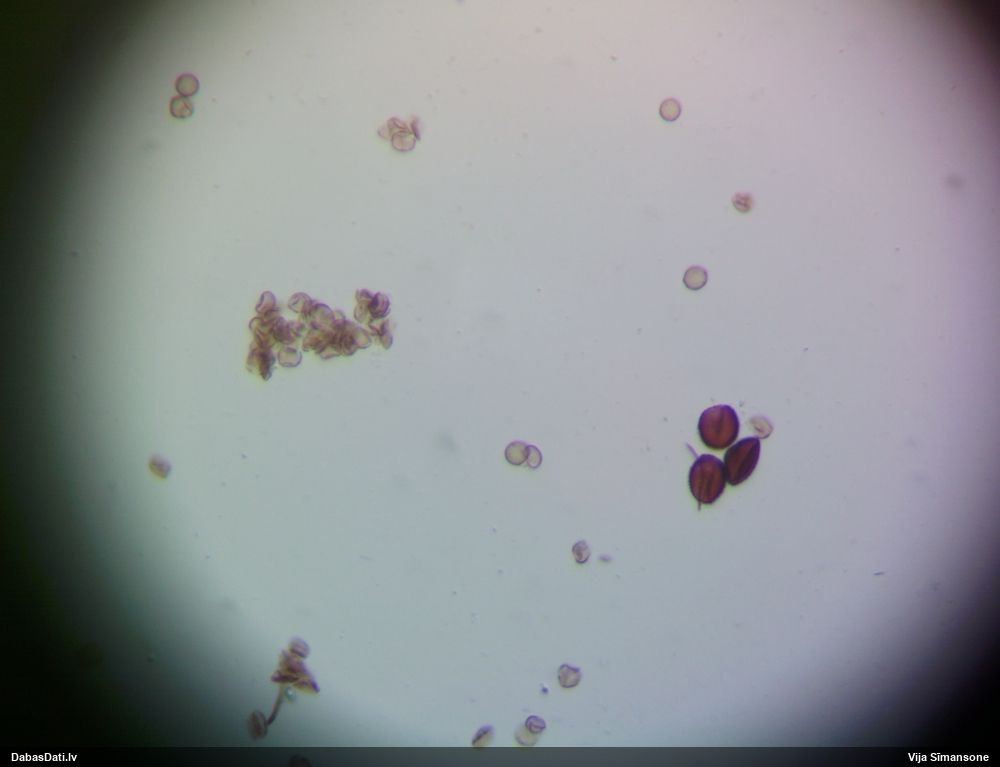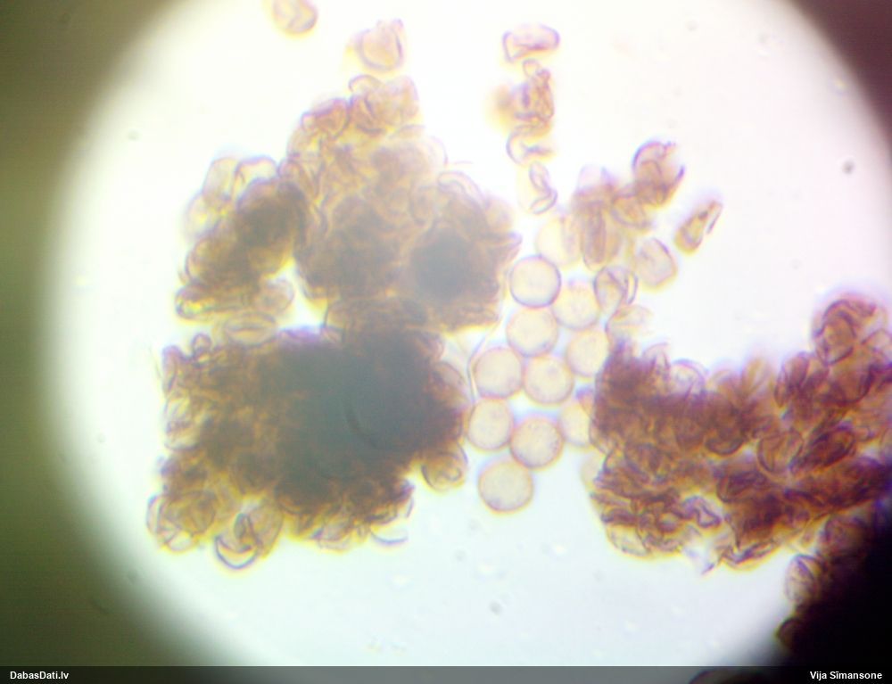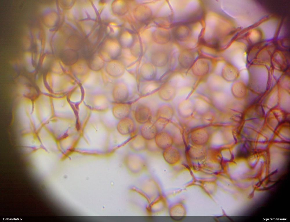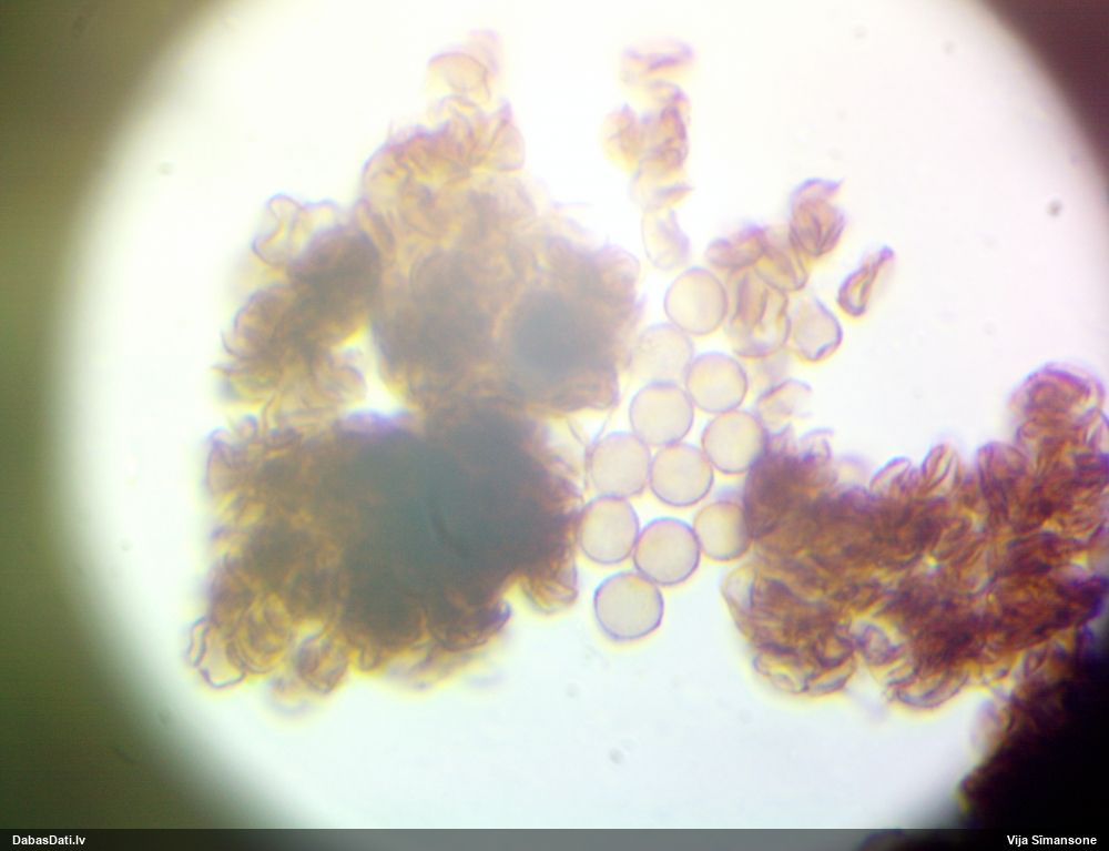 Ar sporām negāja viegli. Ir sīks neregulārs punktējums (kārpiņas?), brīžiem var "uzķert" tādas kā tīklveida struktūras, korektāks sporu diametrs 6,5-7,0 mkm.