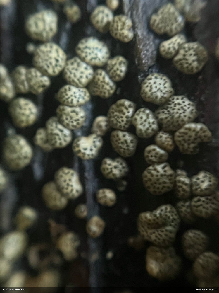 Cik interesanti! Ja es pareizi saprotu, tad kapilīcijs ir tie baltie "krikumi", kas savienoti ar tieviem pavedieniem jeb kapilīcijs ir ar neregulāriem baltiem mezgliem. Tādā gadījumā tai jābūt pumpurītei (Physarum sp.), kaut arī piekrītu, ka no ārpuses izskatās kā Diderma/Didymium. Sporas ir ar vienu pusi gaišāku - svarīga īpaša pazīme. Ar tādiem parametriem (un divām perīdija kārtām) ir zināma Physarum diderma, bet tai sporas ir mazākas (10-12 mkm) un tā aug uz beigtas koksnes. Ja tas ir dzīvs koks, tad vēl jāizskata kādi dzīvo koku varianti.