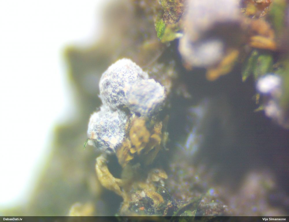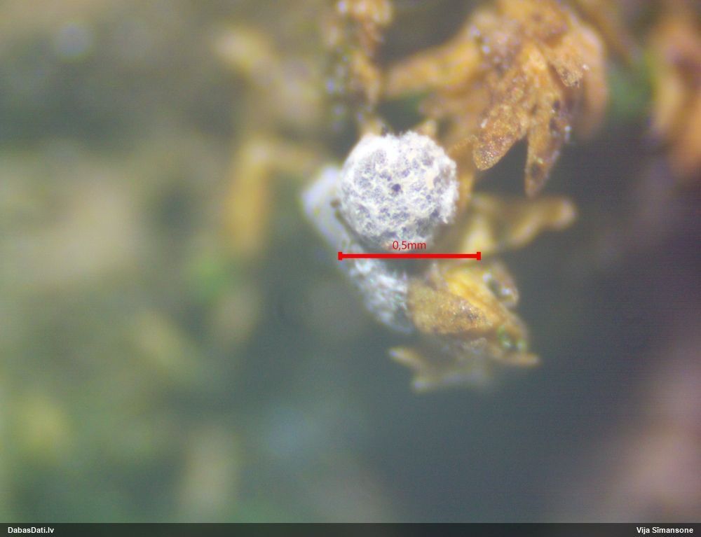Cik interesanti! Ja es pareizi saprotu, tad kapilīcijs ir tie baltie "krikumi", kas savienoti ar tieviem pavedieniem jeb kapilīcijs ir ar neregulāriem baltiem mezgliem. Tādā gadījumā tai jābūt pumpurītei (Physarum sp.), kaut arī piekrītu, ka no ārpuses izskatās kā Diderma/Didymium. Sporas ir ar vienu pusi gaišāku - svarīga īpaša pazīme. Ar tādiem parametriem (un divām perīdija kārtām) ir zināma Physarum diderma, bet tai sporas ir mazākas (10-12 mkm) un tā aug uz beigtas koksnes. Ja tas ir dzīvs koks, tad vēl jāizskata kādi dzīvo koku varianti.