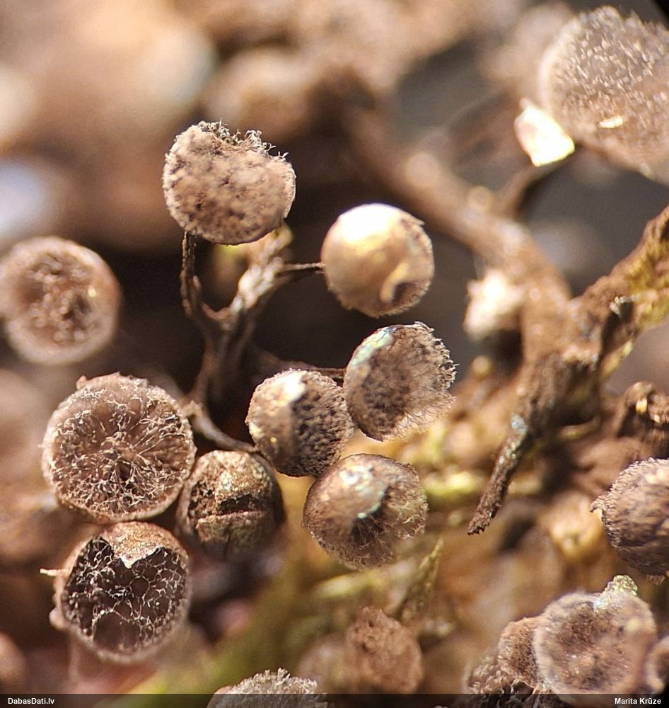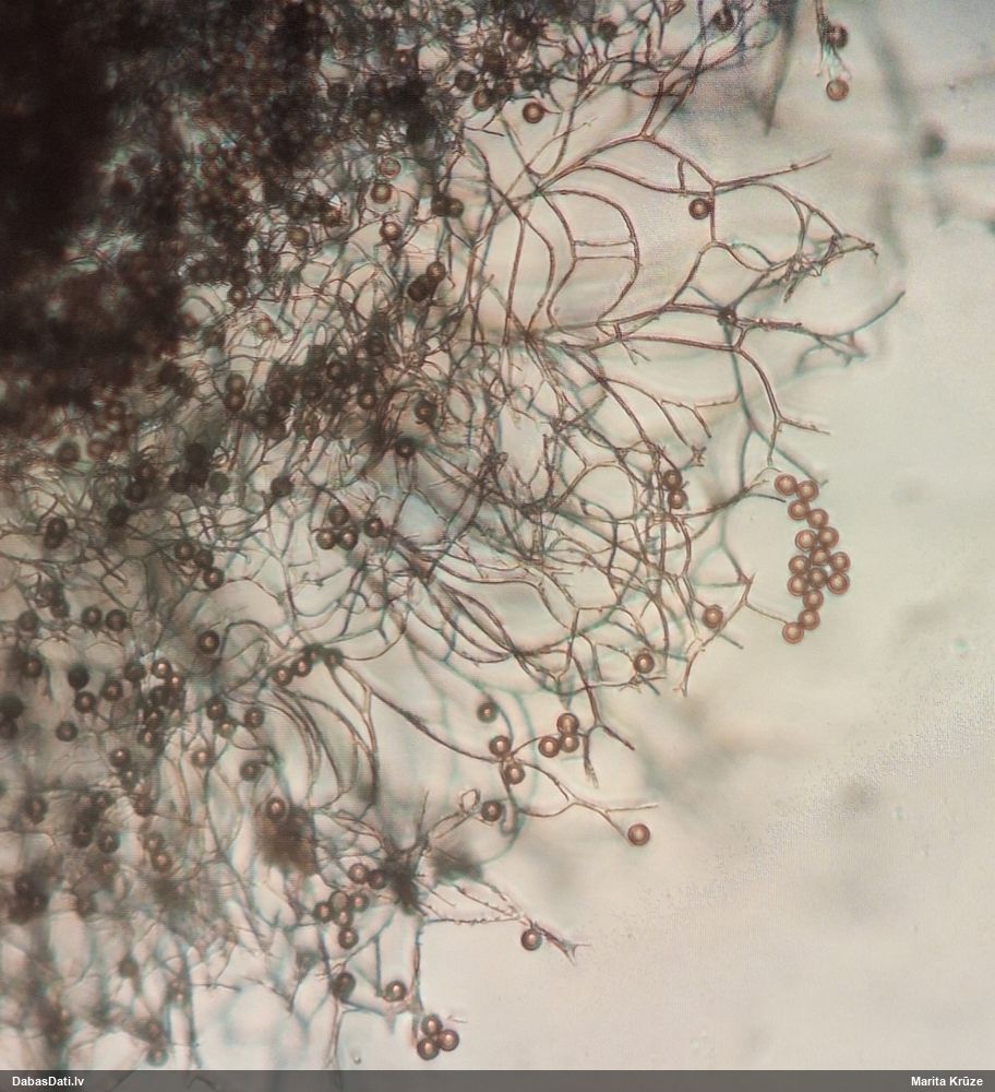 Cik interesanti! Ja es pareizi saprotu, tad kapilīcijs ir tie baltie "krikumi", kas savienoti ar tieviem pavedieniem jeb kapilīcijs ir ar neregulāriem baltiem mezgliem. Tādā gadījumā tai jābūt pumpurītei (Physarum sp.), kaut arī piekrītu, ka no ārpuses izskatās kā Diderma/Didymium. Sporas ir ar vienu pusi gaišāku - svarīga īpaša pazīme. Ar tādiem parametriem (un divām perīdija kārtām) ir zināma Physarum diderma, bet tai sporas ir mazākas (10-12 mkm) un tā aug uz beigtas koksnes. Ja tas ir dzīvs koks, tad vēl jāizskata kādi dzīvo koku varianti.