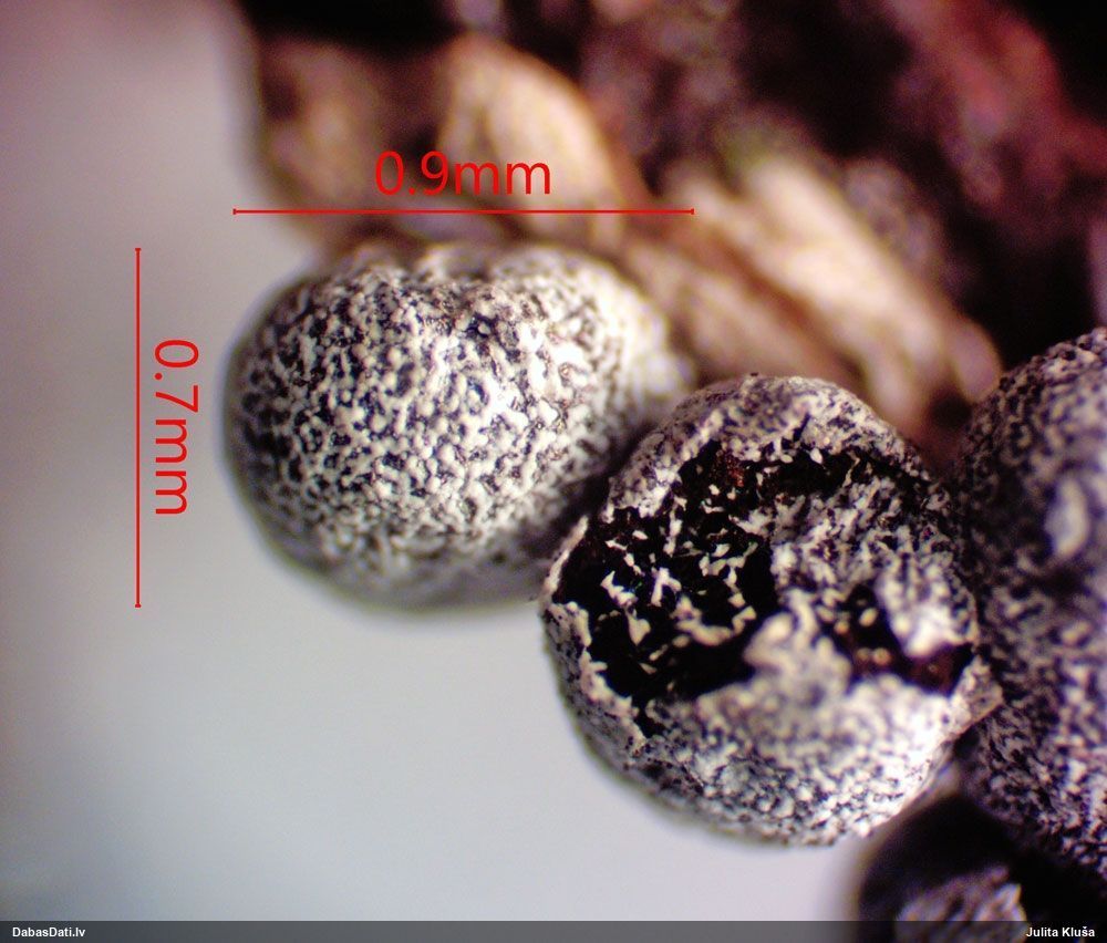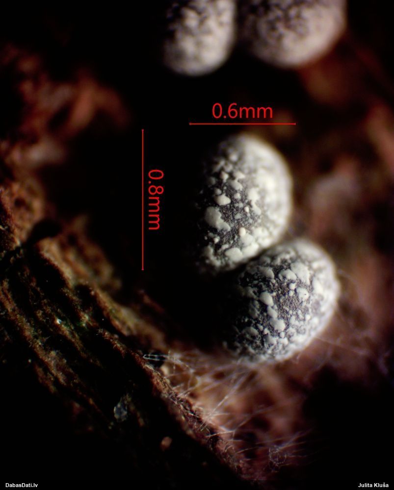 Cik interesanti! Ja es pareizi saprotu, tad kapilīcijs ir tie baltie "krikumi", kas savienoti ar tieviem pavedieniem jeb kapilīcijs ir ar neregulāriem baltiem mezgliem. Tādā gadījumā tai jābūt pumpurītei (Physarum sp.), kaut arī piekrītu, ka no ārpuses izskatās kā Diderma/Didymium. Sporas ir ar vienu pusi gaišāku - svarīga īpaša pazīme. Ar tādiem parametriem (un divām perīdija kārtām) ir zināma Physarum diderma, bet tai sporas ir mazākas (10-12 mkm) un tā aug uz beigtas koksnes. Ja tas ir dzīvs koks, tad vēl jāizskata kādi dzīvo koku varianti.