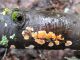 Man pēkšņi radās ideja - vai tur bija nu ļoti mitrs mikroklimats, egle ar melnalksni? Hipotētiski tādas dzeltenas var būt Diachea muscorum. Te bilde ir mazliet līdzīga: https://fr.wikipedia.org/wiki/Fichier:Craterium_muscorum,_Trawscoed,_North_Wales,_Aug_2016_-_Flickr_-_janetgraham84.jpg