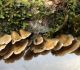 Man pēkšņi radās ideja - vai tur bija nu ļoti mitrs mikroklimats, egle ar melnalksni? Hipotētiski tādas dzeltenas var būt Diachea muscorum. Te bilde ir mazliet līdzīga: https://fr.wikipedia.org/wiki/Fichier:Craterium_muscorum,_Trawscoed,_North_Wales,_Aug_2016_-_Flickr_-_janetgraham84.jpg