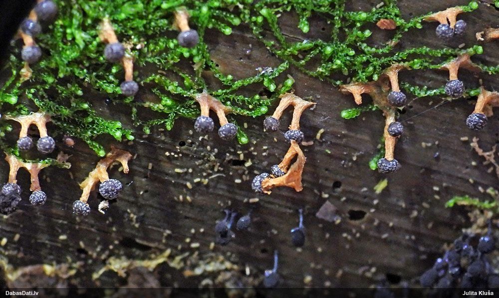 Paldies, Raivo! Ar acu gaišumu man arvien sliktāk, bet mikroskops palīdz. Jā, gribēju teikt, ka paraugam, ja vien nav kāda jutīga atradne, kurai drīkst ievākt tikai mazu gabaliņu, vērts ievākt lielāku gabalu, jo gļotsēnēm patīk kompānija. Un mikroskopa mazajos palielinājumos ar sānu papildus apgaismojumu ir vērts rūpīgi "izstaigāt" visu paraugu. Arī ķērpjus un interesantas sīksēnītes tā var atrast, ko dabā nepamanītu. Ar kriksītēm ir dažādi - pirmās es tā arī tikai citu sugu paraugos pamanīju, bet vēlāk redzēju arī dabā kriskīšu plantācijas - ja to ir daudz, tad var pamanīt jau dabā. Uz sūnām gan ir ekstrēms gadījums, dabā droši nepamanītu, arī eksemplāra noņemšana no sūnas nebija pārāk veiksmīga, tāpēc par noteikšanu mazliet šaubos (sporām mazliet cits tonis). Bet pagaidām citas hipotēzes nav (un konkrētā eksemplāra arī vairs ne).