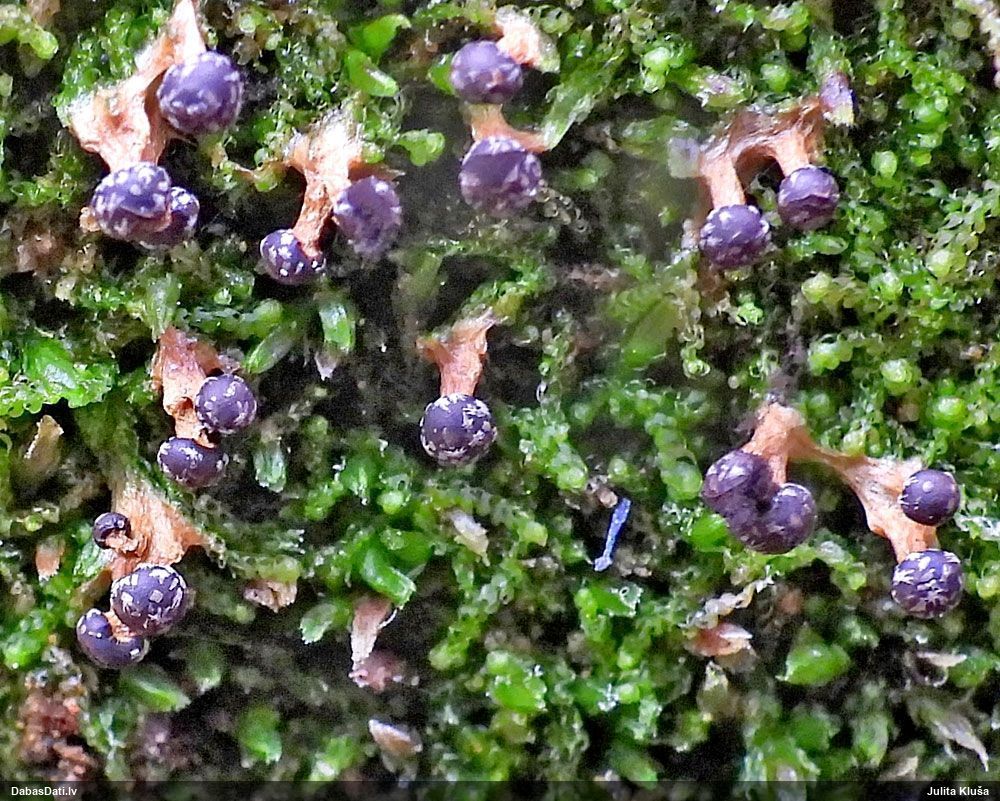 Paldies, Raivo! Ar acu gaišumu man arvien sliktāk, bet mikroskops palīdz. Jā, gribēju teikt, ka paraugam, ja vien nav kāda jutīga atradne, kurai drīkst ievākt tikai mazu gabaliņu, vērts ievākt lielāku gabalu, jo gļotsēnēm patīk kompānija. Un mikroskopa mazajos palielinājumos ar sānu papildus apgaismojumu ir vērts rūpīgi "izstaigāt" visu paraugu. Arī ķērpjus un interesantas sīksēnītes tā var atrast, ko dabā nepamanītu. Ar kriksītēm ir dažādi - pirmās es tā arī tikai citu sugu paraugos pamanīju, bet vēlāk redzēju arī dabā kriskīšu plantācijas - ja to ir daudz, tad var pamanīt jau dabā. Uz sūnām gan ir ekstrēms gadījums, dabā droši nepamanītu, arī eksemplāra noņemšana no sūnas nebija pārāk veiksmīga, tāpēc par noteikšanu mazliet šaubos (sporām mazliet cits tonis). Bet pagaidām citas hipotēzes nav (un konkrētā eksemplāra arī vairs ne).