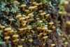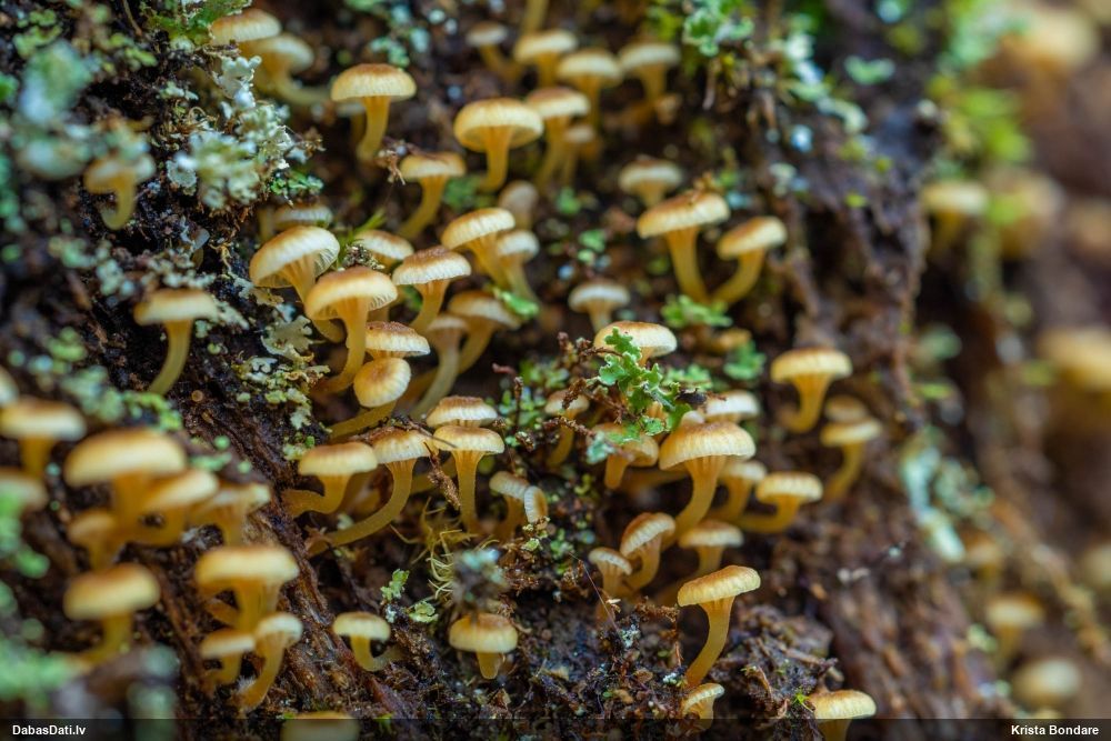 Man pēkšņi radās ideja - vai tur bija nu ļoti mitrs mikroklimats, egle ar melnalksni? Hipotētiski tādas dzeltenas var būt Diachea muscorum. Te bilde ir mazliet līdzīga: https://fr.wikipedia.org/wiki/Fichier:Craterium_muscorum,_Trawscoed,_North_Wales,_Aug_2016_-_Flickr_-_janetgraham84.jpg