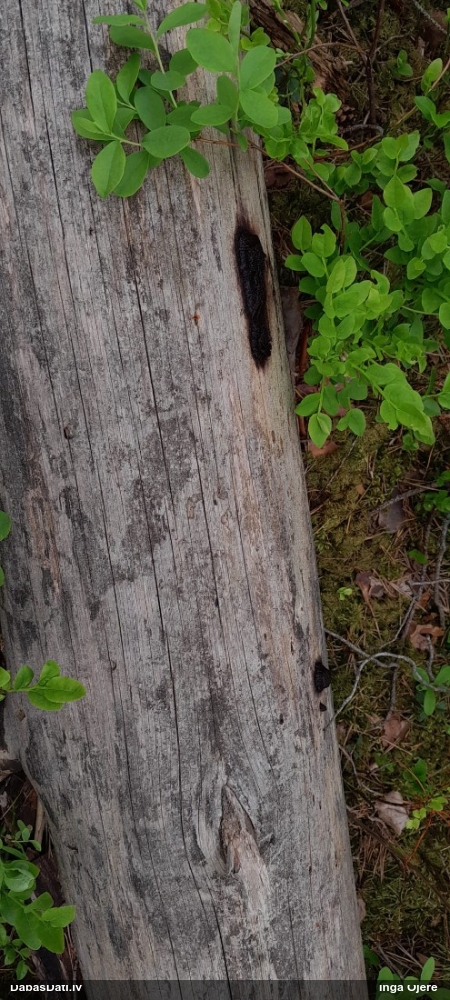 Ja uz beigta koka, tad ticamākā laikam ir B.affinis var. microspora, lai gan tā aug uz mizas. Bet varbūt tieši apakšā gļotsēnēm ir kādi mizas fragmentiņi?