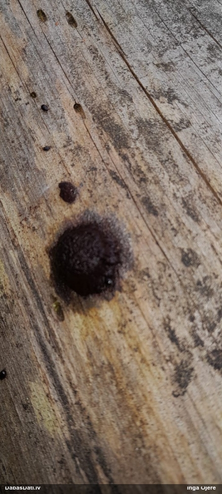 Ja uz beigta koka, tad ticamākā laikam ir B.affinis var. microspora, lai gan tā aug uz mizas. Bet varbūt tieši apakšā gļotsēnēm ir kādi mizas fragmentiņi?