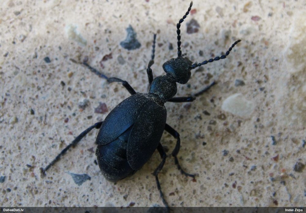 Jāredz tuvāk (kaut vai izkadrēts šis pats attēls) - varbūt tumšā eļļasvabole (Meloe proscarabaeus)