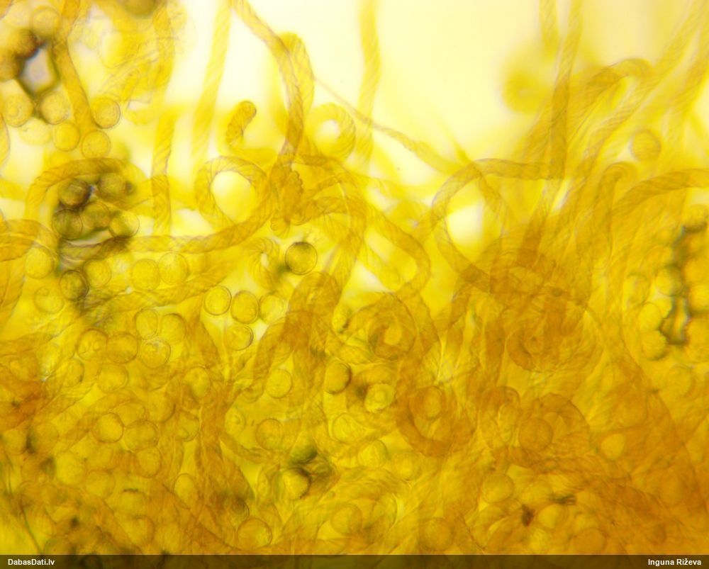 Šis man pašai sanāca pārsteigums. Ievācu paraugu ar domu "varbūt tur ir gļotsēne", dodot varbūtību apmēram pusprocentu, ka ir. Bet no mikroskopijas starp galīgi vecām sporām izdevās atrast ne tikai dažas labas, bet, galvenais, arī perfektus kapilīcija fragmentus, no kura suga, vēl kopā ar sporu pazīmēm, nosakāma nešaubīgi.