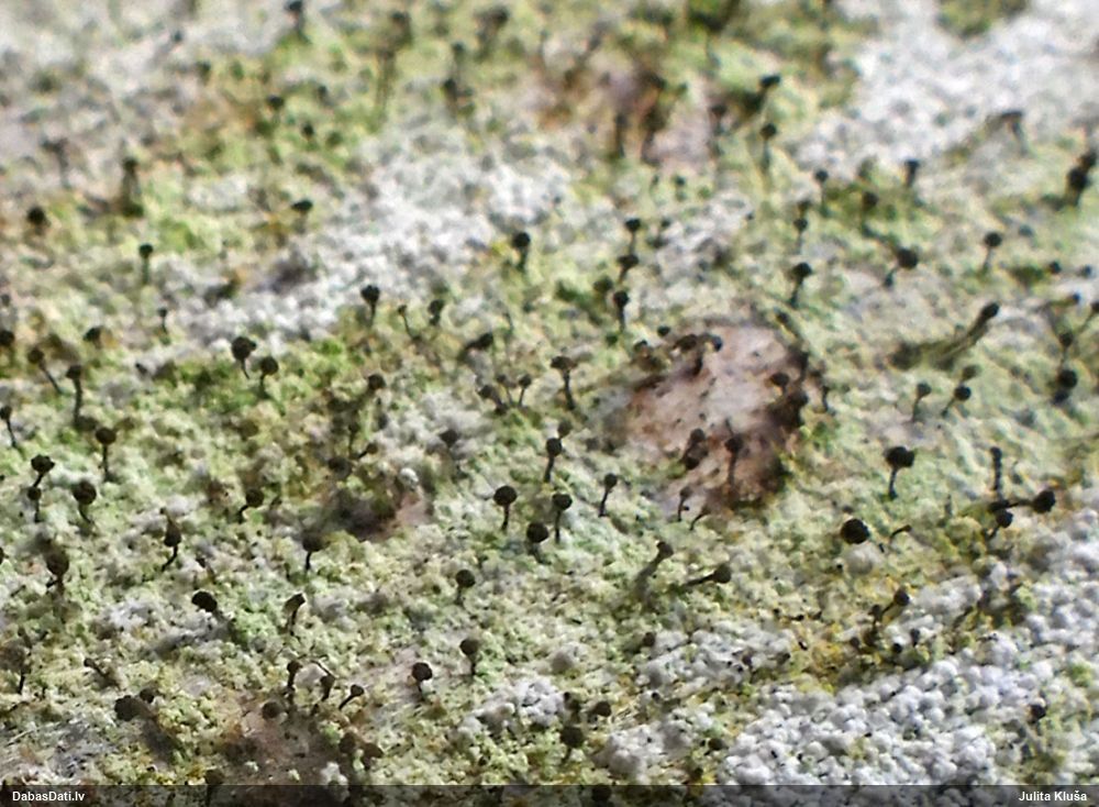 Raivo, nebūs Chaenotheca furfuracea, bet gan C.brachypoda (dabisku mežu indikatorsuga). C.furfuracea ir ar izteiktu laponi, daudz lielāki aķ un košāk zaļa krāsa
