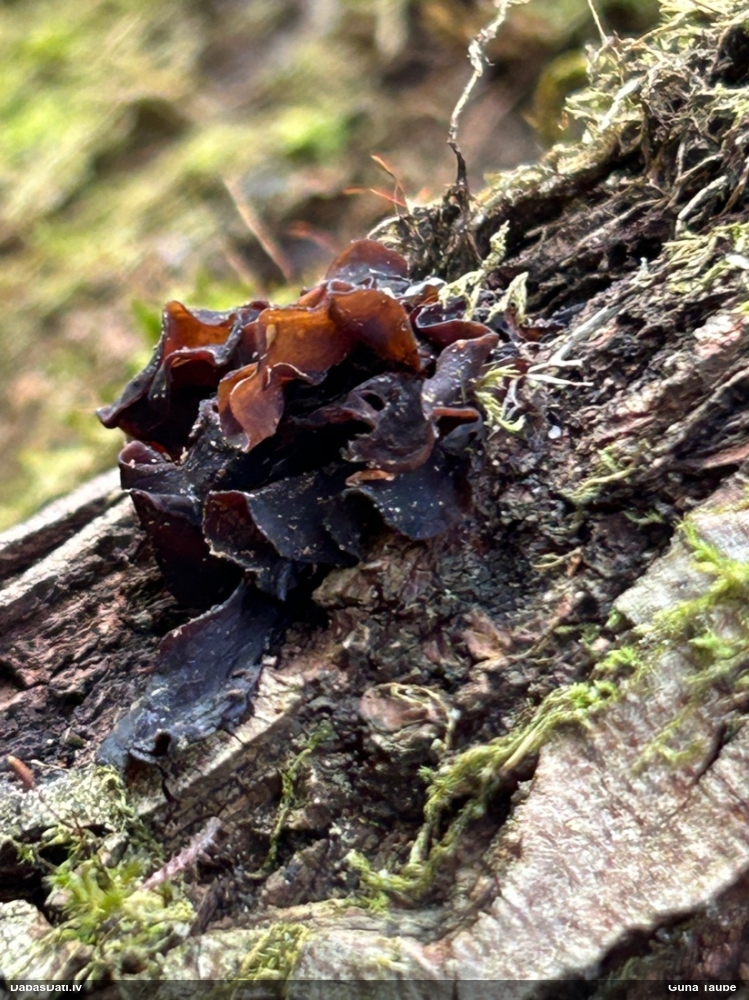 Satrūdējusi kritala mežā, nav dēļi. Iespējams, egle, jauktu koku mežs.