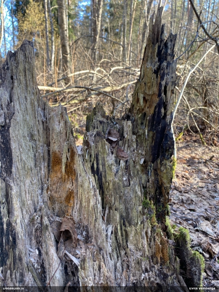 Satrūdējusi kritala mežā, nav dēļi. Iespējams, egle, jauktu koku mežs.