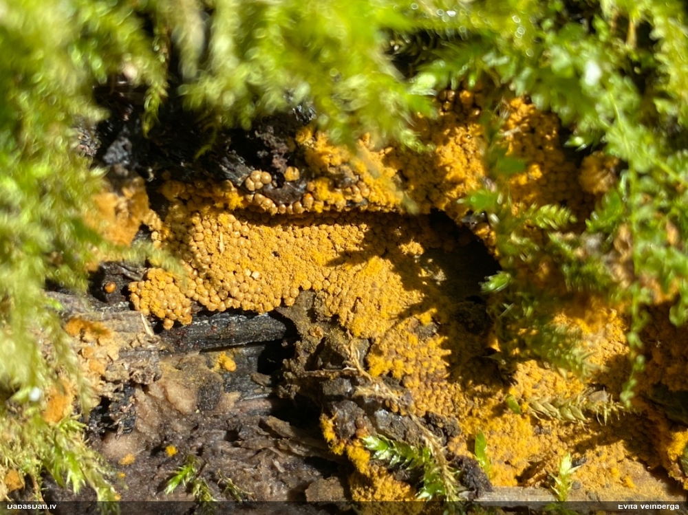 Nezinu, kāpēc šis nav izskatīts kā pēcsniedzīte. 24. marts pavasarī, kad bija daudz sniega. Pēc sporām varētu atbilst divas sugas - Physarum alpinum un Physarum albescens. Abām minētas 2 perīdija kārtas, bet redzu tikai vienu plānu, dzeltenu. Šīm sugām maz foto, bet esošajos arī tās divas kārtas nav uzskatāmi. Kopskats mēdz būt tik dažāds, ka grūti pateikt, cik šis atbilst.