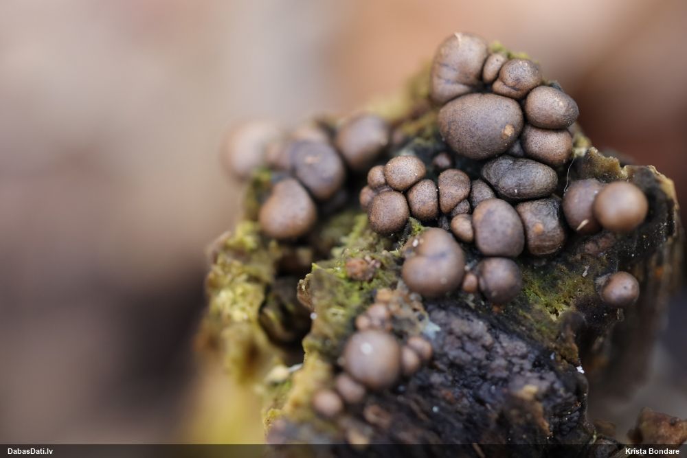 Izskatīju zinātnē aprakstītās Badhamia. Un Badhamiopsis. Tuvākā izskatās Badhamiopsis nivisimulans, kam raksturīgas ciešas grupas uz dzīviem kokiem (bet vai šis ir dzīvs?). Sporas līdzīgas, bet te raksturīgas arī dažas ļoti ovālas un lielas sporas, kādas foto neredz, bet varbūt ir? Un jābūt ar gaišu līniju pāri, to pagaidam neatradu. Bet tonis un kārpas līdzīgas. Izmēram būtu jabūt (10-)11-14 mkm vai ovālām garākām. Es teiktu, ka šai līdzīga, bet cita suga. Bet citu man piedāvājumā pagaidām nav. Pēdējā foto teiktu, ka sporas negrupējas, tad atkrīt B.juliae. Bet tikko pamanīju priekšpēdējo foto un tagad man nav pārliecības, grupējas vai nē.