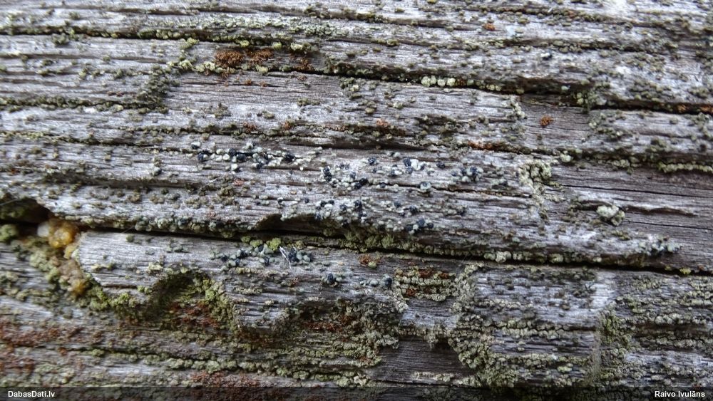 Ja uz beigta koka, tad ticamākā laikam ir B.affinis var. microspora, lai gan tā aug uz mizas. Bet varbūt tieši apakšā gļotsēnēm ir kādi mizas fragmentiņi?
