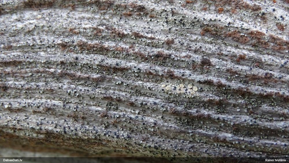 Ja uz beigta koka, tad ticamākā laikam ir B.affinis var. microspora, lai gan tā aug uz mizas. Bet varbūt tieši apakšā gļotsēnēm ir kādi mizas fragmentiņi?