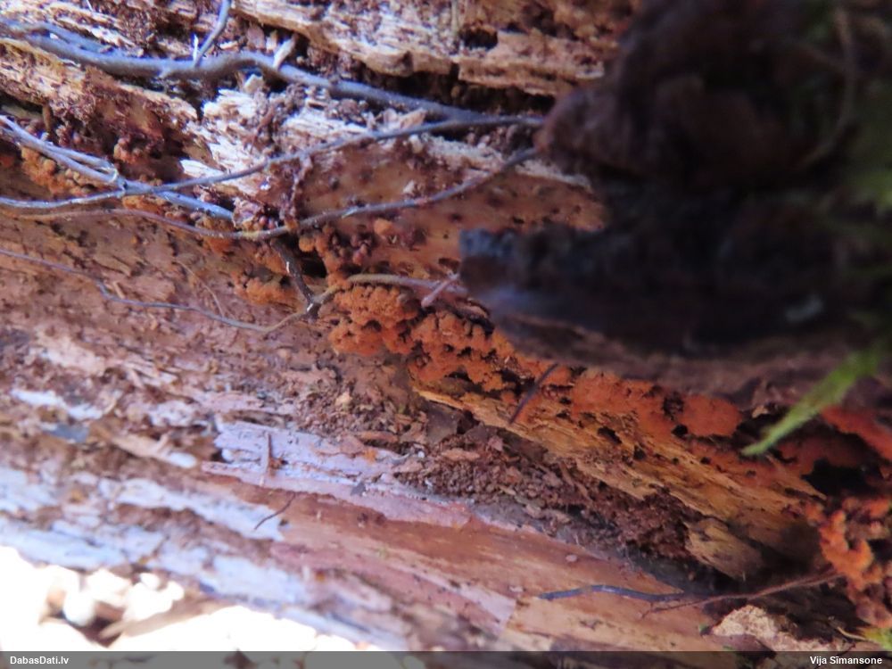 Šobrīd varu iedomāties 2 variantus - melnā plaispika Amaurochaete atra vai parastais gļotpūpēdis Reticularia lycoperdon. Pēc izmēra, augšanas laika un augšanas uz apstrādāta koka atbilst abas.