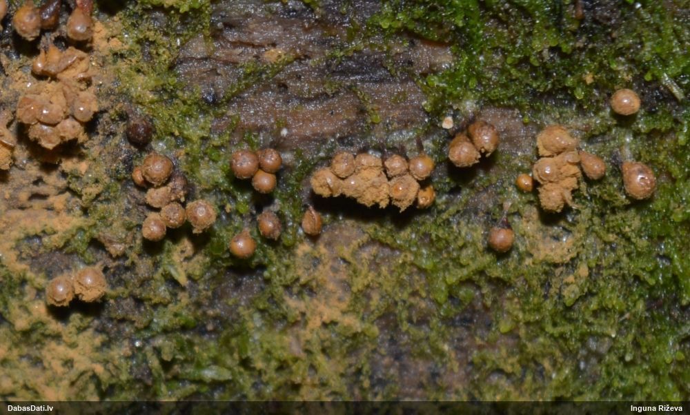Ja uz beigta koka, tad ticamākā laikam ir B.affinis var. microspora, lai gan tā aug uz mizas. Bet varbūt tieši apakšā gļotsēnēm ir kādi mizas fragmentiņi?