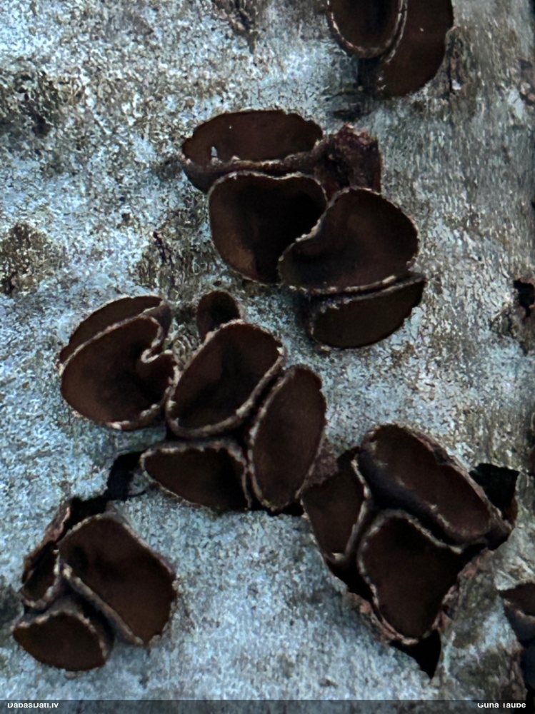 Šis interesants. Uz sausām priedes kritalām rozā mazi līdzīga izskata augļķermeņi maijā aug divām citādi atšķirīgām sugām (dažādās dzimtās) - melnajai plaispikai Amaurochaete atra un trauslajam gļotpūpēdim Reticularia jurana. Pēc sīkām mikropazīmēm (foto nav redzama pat ne sīka balta pakāje ap augļķermeni, un uz virsmas ar lielu piepūli var ja ne saskatīt, tad iztēloties tīklotu virsmas rakstu) izšķīros par biežāko no abām - melno plaispiku, kas tipiski aug samērā atklātās, skrajās vietās, t.sk. nesenos izcirtumos.