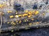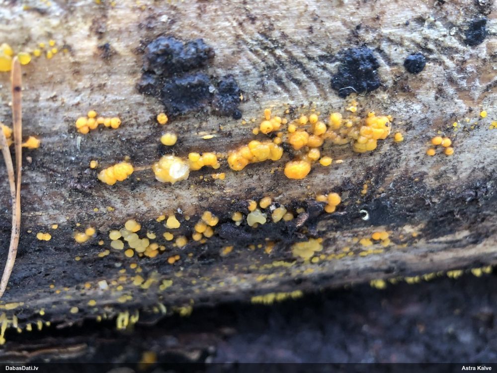 Man pēkšņi radās ideja - vai tur bija nu ļoti mitrs mikroklimats, egle ar melnalksni? Hipotētiski tādas dzeltenas var būt Diachea muscorum. Te bilde ir mazliet līdzīga: https://fr.wikipedia.org/wiki/Fichier:Craterium_muscorum,_Trawscoed,_North_Wales,_Aug_2016_-_Flickr_-_janetgraham84.jpg