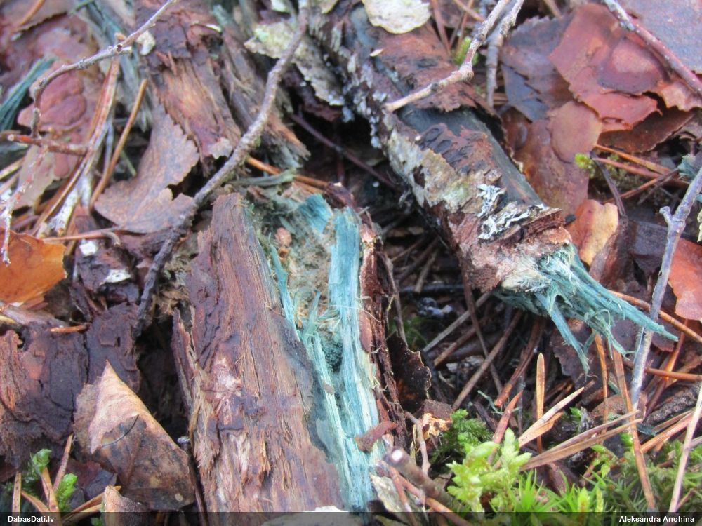 Ja uz beigta koka, tad ticamākā laikam ir B.affinis var. microspora, lai gan tā aug uz mizas. Bet varbūt tieši apakšā gļotsēnēm ir kādi mizas fragmentiņi?
