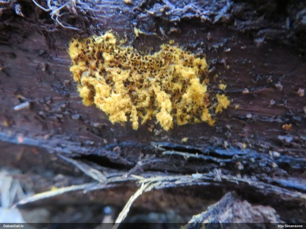 Šobrīd varu iedomāties 2 variantus - melnā plaispika Amaurochaete atra vai parastais gļotpūpēdis Reticularia lycoperdon. Pēc izmēra, augšanas laika un augšanas uz apstrādāta koka atbilst abas.
