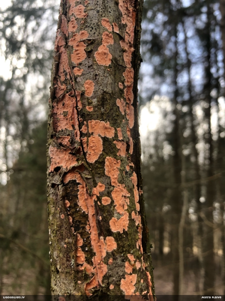 Šis interesants. Uz sausām priedes kritalām rozā mazi līdzīga izskata augļķermeņi maijā aug divām citādi atšķirīgām sugām (dažādās dzimtās) - melnajai plaispikai Amaurochaete atra un trauslajam gļotpūpēdim Reticularia jurana. Pēc sīkām mikropazīmēm (foto nav redzama pat ne sīka balta pakāje ap augļķermeni, un uz virsmas ar lielu piepūli var ja ne saskatīt, tad iztēloties tīklotu virsmas rakstu) izšķīros par biežāko no abām - melno plaispiku, kas tipiski aug samērā atklātās, skrajās vietās, t.sk. nesenos izcirtumos.
