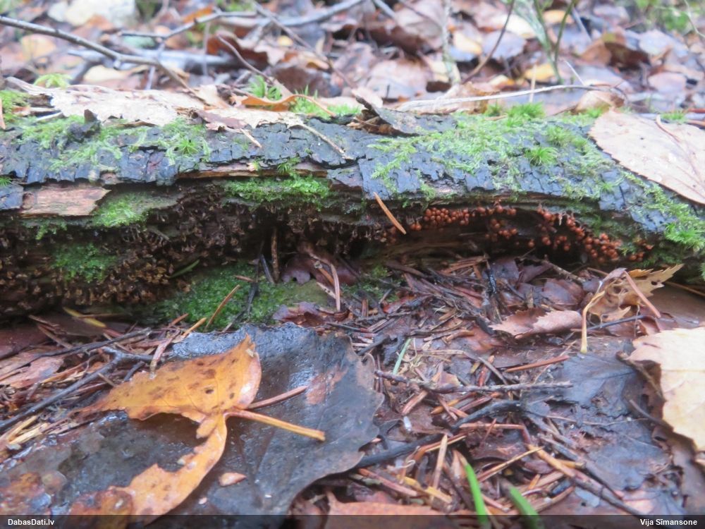 Domāju to Sorocybe resinae, ja tā, tad esmu soli tuvāk mērķim, nu zinu, kā izskatās un kur meklēt. Gļotsēnītes klāt gan nebija.