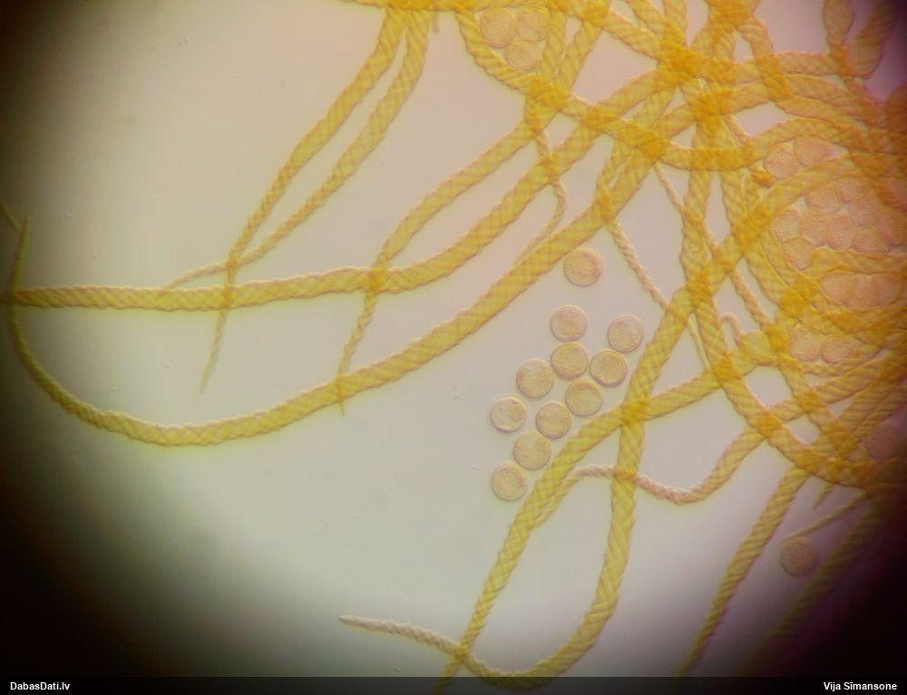 Paldies, Raivo! Ar acu gaišumu man arvien sliktāk, bet mikroskops palīdz. Jā, gribēju teikt, ka paraugam, ja vien nav kāda jutīga atradne, kurai drīkst ievākt tikai mazu gabaliņu, vērts ievākt lielāku gabalu, jo gļotsēnēm patīk kompānija. Un mikroskopa mazajos palielinājumos ar sānu papildus apgaismojumu ir vērts rūpīgi "izstaigāt" visu paraugu. Arī ķērpjus un interesantas sīksēnītes tā var atrast, ko dabā nepamanītu. Ar kriksītēm ir dažādi - pirmās es tā arī tikai citu sugu paraugos pamanīju, bet vēlāk redzēju arī dabā kriskīšu plantācijas - ja to ir daudz, tad var pamanīt jau dabā. Uz sūnām gan ir ekstrēms gadījums, dabā droši nepamanītu, arī eksemplāra noņemšana no sūnas nebija pārāk veiksmīga, tāpēc par noteikšanu mazliet šaubos (sporām mazliet cits tonis). Bet pagaidām citas hipotēzes nav (un konkrētā eksemplāra arī vairs ne).