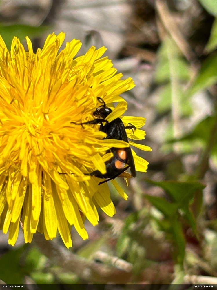 Jāredz tuvāk (kaut vai izkadrēts šis pats attēls) - varbūt tumšā eļļasvabole (Meloe proscarabaeus)