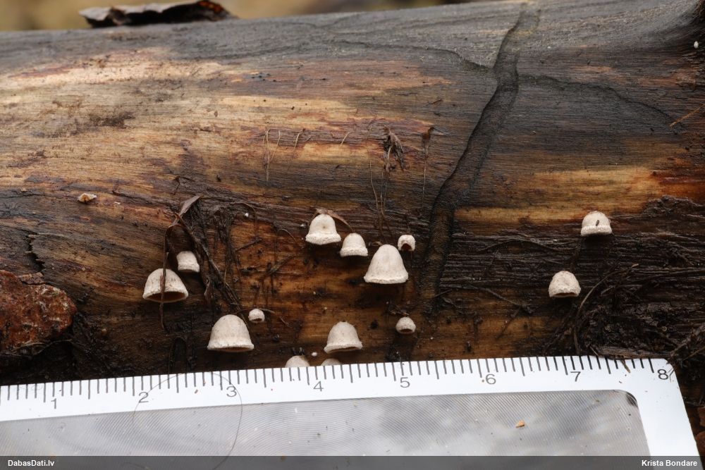 Ja uz beigta koka, tad ticamākā laikam ir B.affinis var. microspora, lai gan tā aug uz mizas. Bet varbūt tieši apakšā gļotsēnēm ir kādi mizas fragmentiņi?