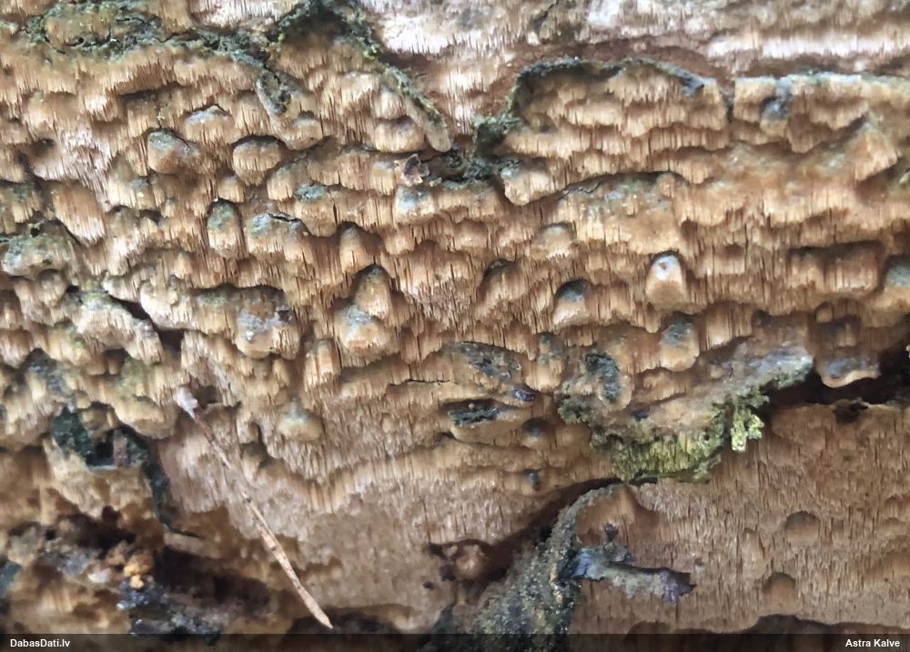 Ja uz beigta koka, tad ticamākā laikam ir B.affinis var. microspora, lai gan tā aug uz mizas. Bet varbūt tieši apakšā gļotsēnēm ir kādi mizas fragmentiņi?